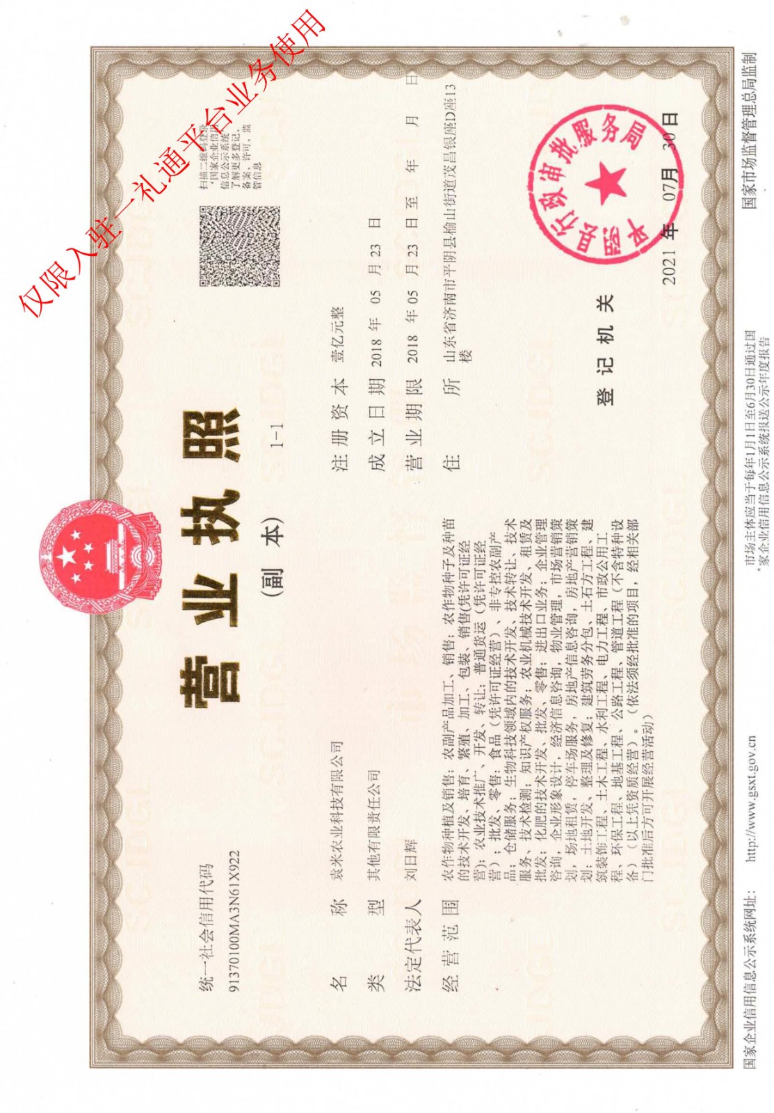 - 經營范圍:農副產品加工、銷售;農作物種子及種苗的技術開發、培育、繁殖、加工、包裝、銷售(憑許可證經營);農業技術推廣、開發、轉讓;普通貨運(憑許可證經營);批發、零售:食品(憑許可證經營)、非專控農副產品;倉儲服務;生物科技領域內的技術開發、技術轉讓、技術服務、技術檢測;知識產權服務;農業機械技術開發、租賃及批發;化肥的技術開發、批發、零售;進出口業務;企業管理咨詢,企業形象設計,經濟信息咨詢,物業管理,市場營銷策劃,場地租賃,停車場服務,房地產信息咨詢,房地產營銷策劃;土地開發、整理及修復;建筑勞務分包、土石方工程、建筑裝飾工程、土木工程、水利工程、電力工程、市政公用工程、環保工程、地基工程、公路工程、管道工程(不含特種設備)(以上憑資質經營)。