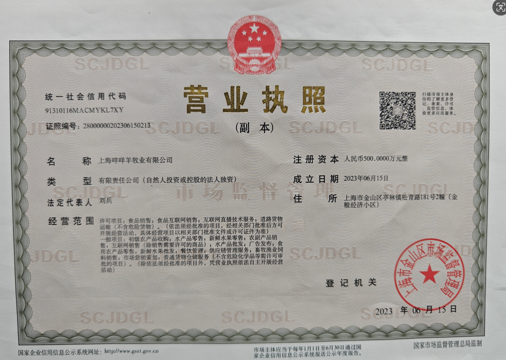 - 經(jīng)營范圍:生鮮食品、牛羊豬肉禮品禮盒、批發(fā)、團購等,食品銷售;食品互聯(lián)網(wǎng)銷售;互聯(lián)網(wǎng)直播技術(shù)服務(wù);道路貨物運輸(不含危險貨物)。(依法須經(jīng)批準的項目,經(jīng)相關(guān)部門批準后方可開展經(jīng)營活動,具體經(jīng)營項目以相關(guān)部門批準文件或許可證件為準)一般項目:初級農(nóng)產(chǎn)品收購;水產(chǎn)品零售;新鮮水果零售;農(nóng)副產(chǎn)品銷售;互聯(lián)網(wǎng)銷售(除銷售需要許可的商品);水產(chǎn)品批發(fā);廣告發(fā)布;食用農(nóng)產(chǎn)品零售;新鮮水果批發(fā);餐飲管理;供應(yīng)鏈管理服務(wù);畜牧漁業(yè)飼料銷售;市場營銷策劃;普通貨物倉儲服務(wù)(不含危險化學(xué)品等需許可審批的項目)。