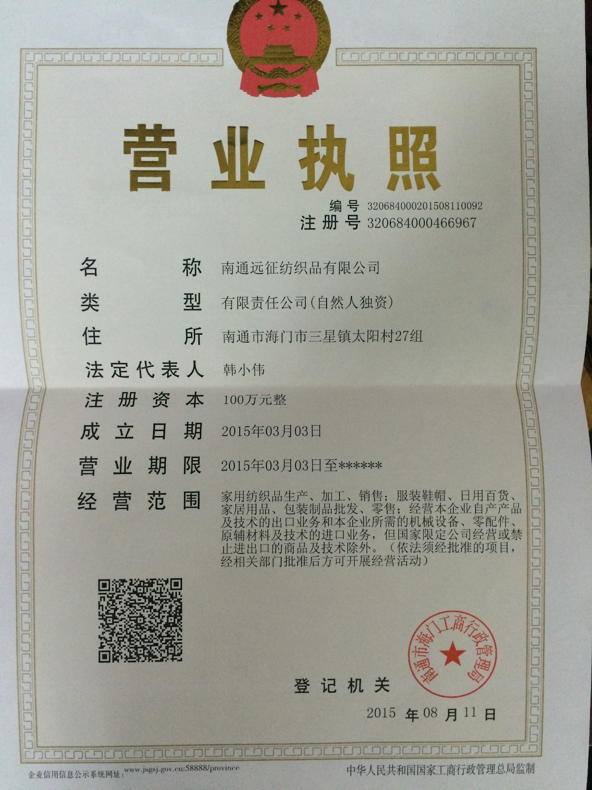- 經營范圍:家用紡織品生產、加工、銷售;服裝鞋帽、日用百貨、家居用品、包裝制品批發、零售;經營本企業自產產品及技術的出口業務和本企業所需的機械設備、零配件、原輔材料及技術的進口業務,但國家限定公司經營或禁止進出口的商品及技術除外。(依法須經批準的項目,經相關部門批準后方可開展經營活動)