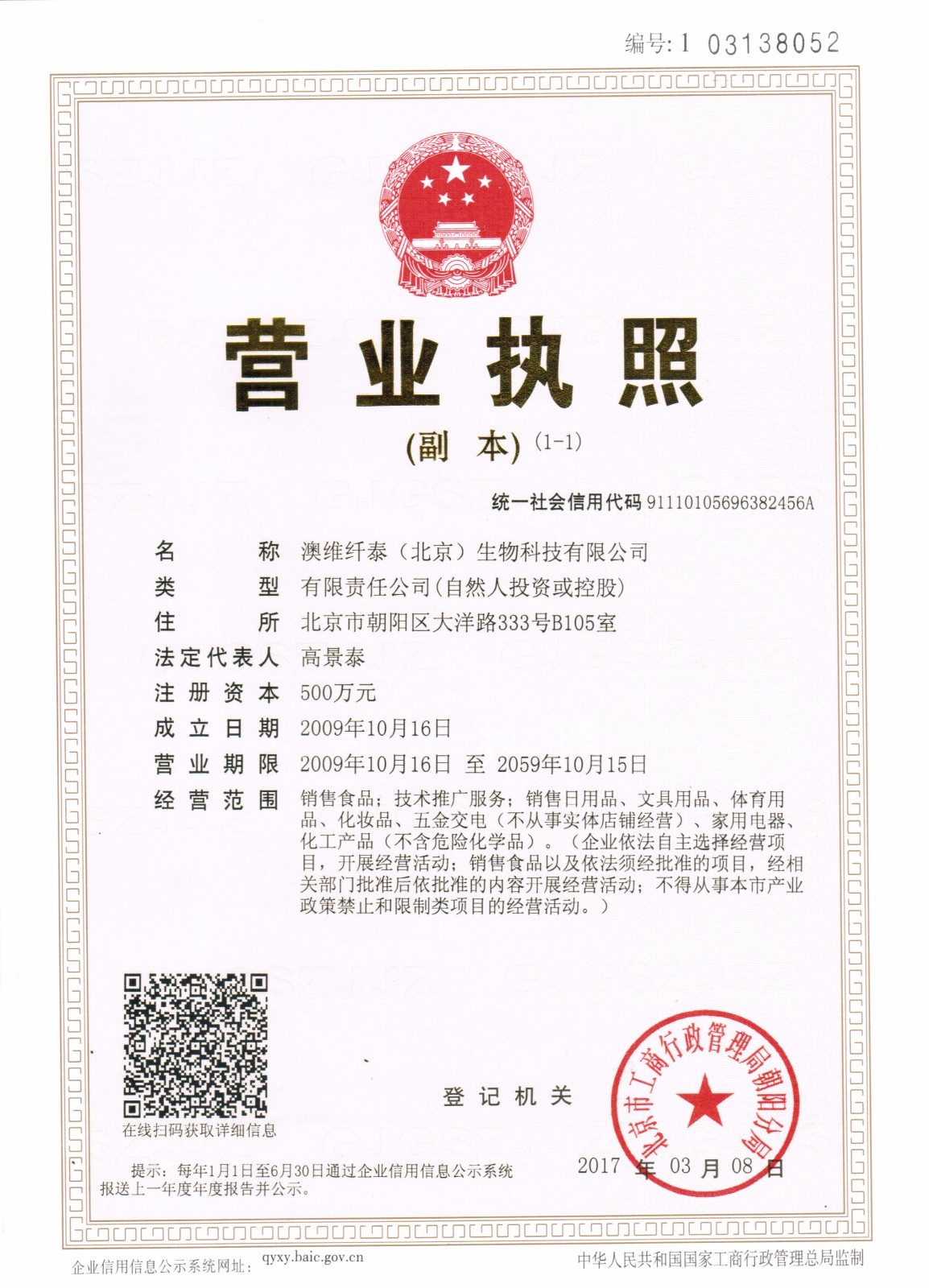 - 經營范圍:銷售食品;技術推廣服務;銷售日用品、文具用品、體育用品、化妝品、五金交電(不從事實體店鋪經營)、家用電器、化工產品(不含危險化學品)。(企業依法自主選擇經營項目,開展經營活動;銷售食品以及依法須經批準的項目,經相關部門批準后依批準的內容開展經營活動;不得從事本市產業政策禁止和限制類項目的經營活動。)