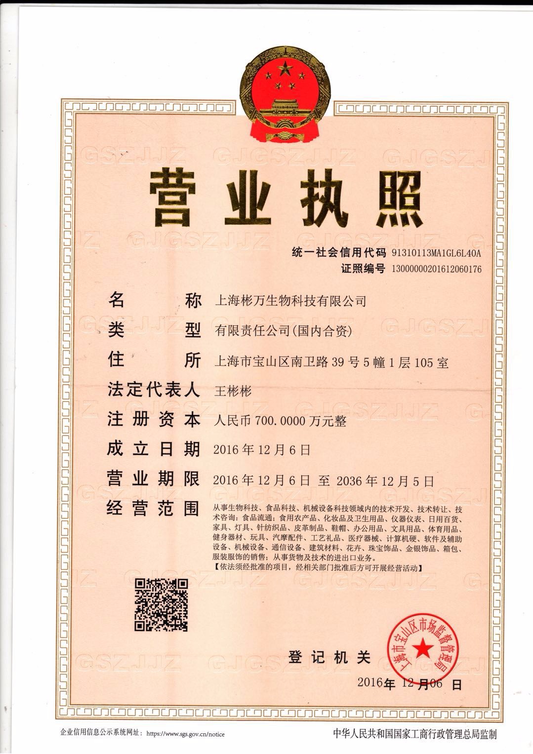 - 經營范圍:從事生物科技、食品科技、機械設備科技領域內的技術開發、技術轉讓、技術咨詢食品流通;食用農產品、化妝品及衛生用品、儀器儀表、日用百貨、家具、燈具、針紡織品、皮革制品、鞋帽、辦公用品、文具用品、體育用品、健身器材、玩具、汽摩配件、工藝禮品、醫療器械、計算機硬、軟件及輔助設備、機械設備、通信設備、建筑材料、花卉、珠寶飾品,金銀飾品、箱包、服裝服飾的銷售;從事貨物及技術的進出口業務
