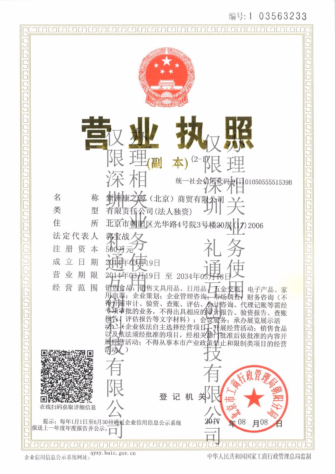 - 經營范圍:銷售食品。銷售文具用品、日用品、五金交電、電子產品、家用電器;企業策劃;企業管理咨詢;市場調查;財務咨詢(不得開展審計、驗資、查賬、評估、會計咨詢、代理記賬等需經專項審批的業務,不得出具相應的審計報告、驗資報告、查賬報告、評估報告等文字材料);會議服務;承辦展覽展示活動;貨物進出口、代理進出口、技術進出口。企業依法自主選擇經營項目,開展經營活動;銷售食品以及依法須經批準的項目,經相關部門批準后依批準的內容開展經營活動;不得從事本市產業政策禁止和限制類項目的經營活動