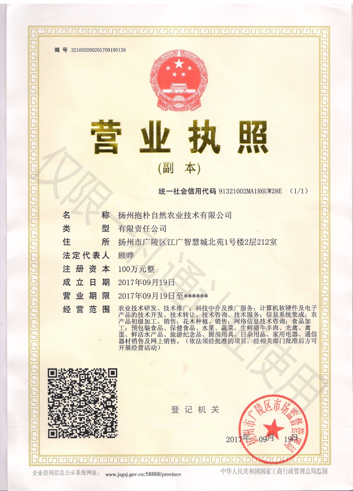 - 經營范圍:農業技術研發、技術推廣;科技中介及推廣服務;計算機軟硬件及電子產品的技術開發、技術轉讓、技術咨詢、技術服務;信息系統集成;農產品初級加工、銷售;花木種植、銷售;網絡信息技術咨詢;食品加工;預包裝食品、保健食品、水果、蔬菜、生鮮豬牛羊肉、光禽、禽蛋、鮮活水產品、旅游紀念品、廚房用具、日雜用品、家用電器、通信器材銷售及網上銷售。(依法須經批準的項目,經相關部門批準后方可開展經營活動)