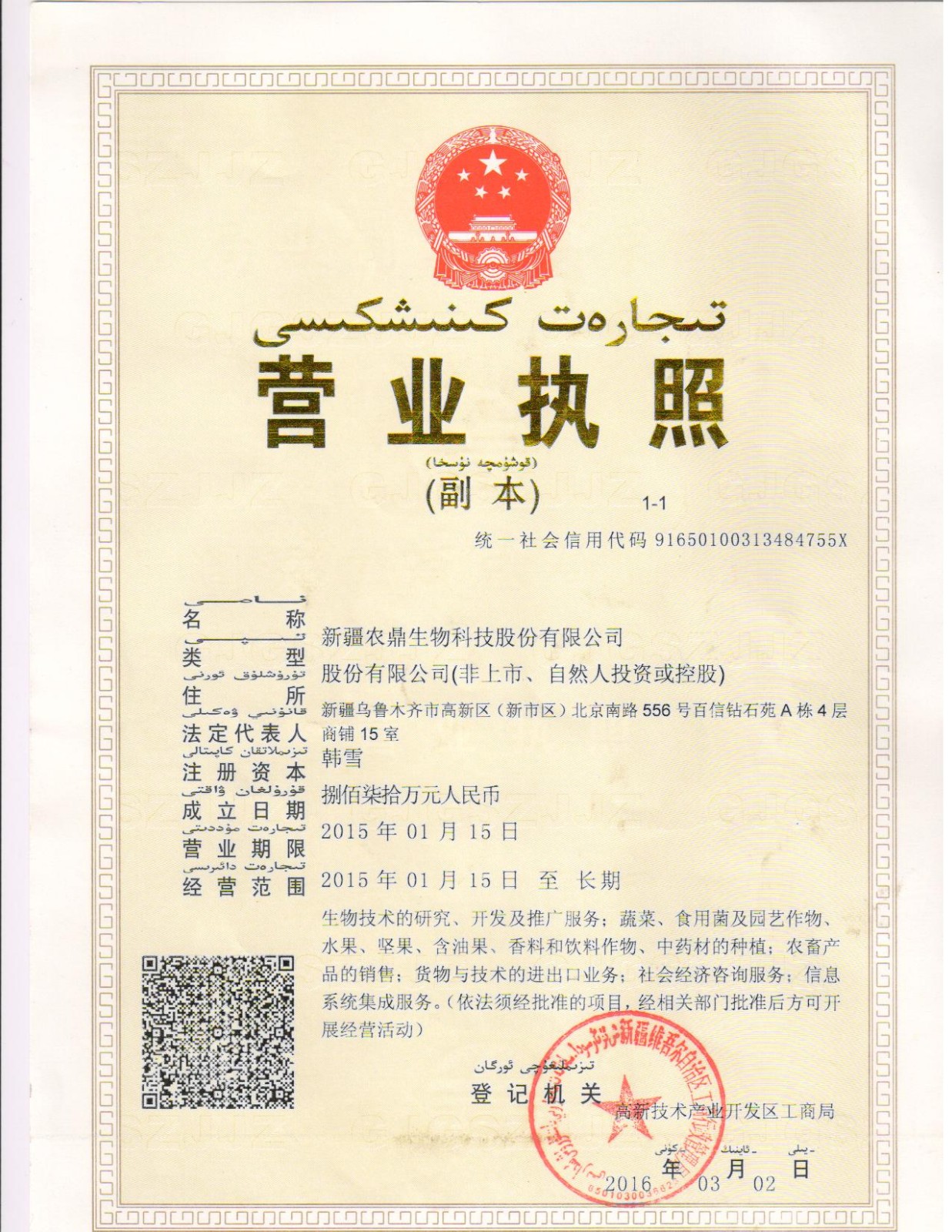 - 經營范圍:生物技術的研究、開發及推廣服務;蔬菜、食用菌及園藝作物、水果、堅果、含油果、香料和飲料作物,中藥材的種植;農畜產品的銷售;貨物與技術的進出口業務;社會經濟咨詢服務;信息系統集成服務。