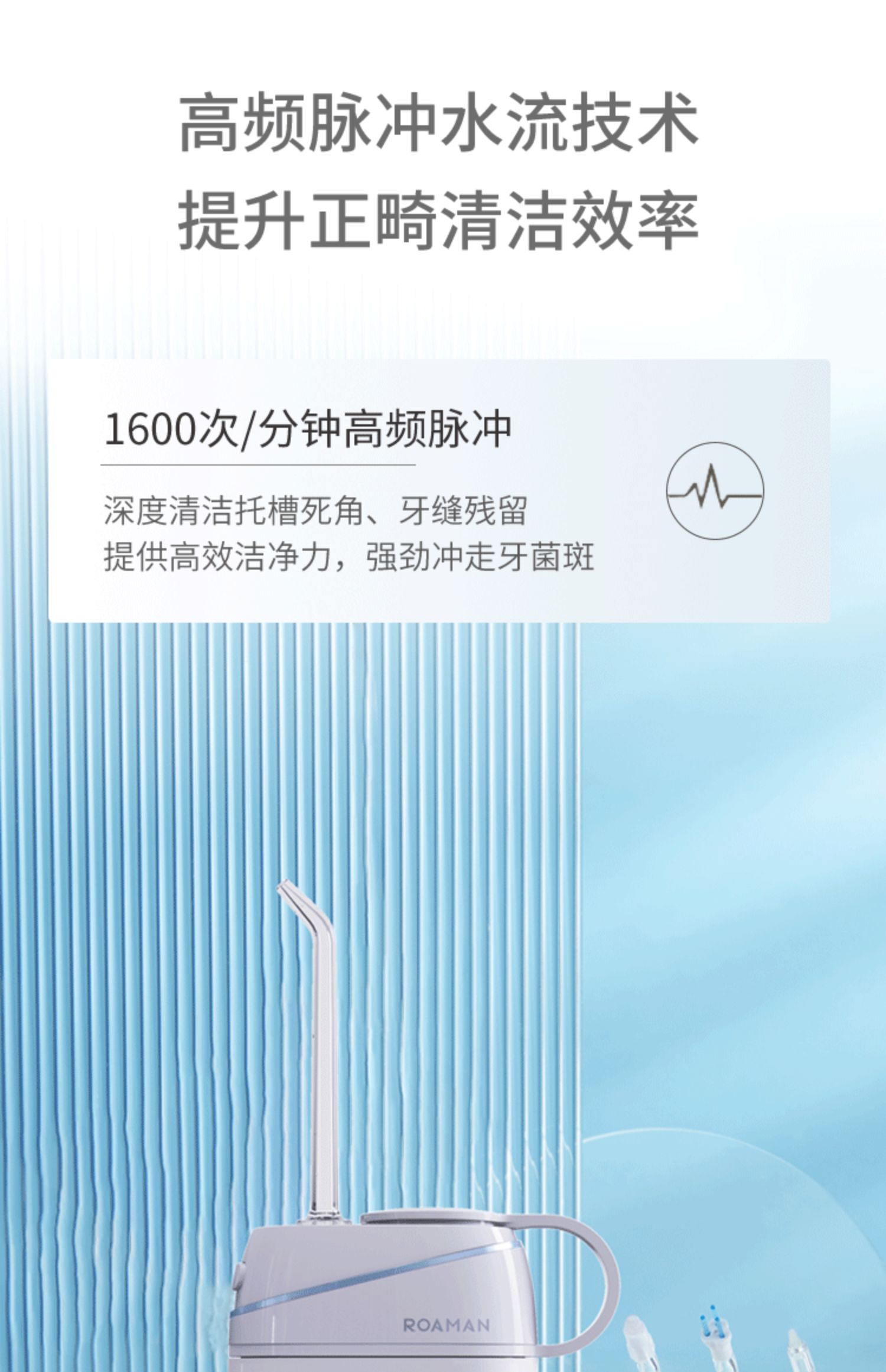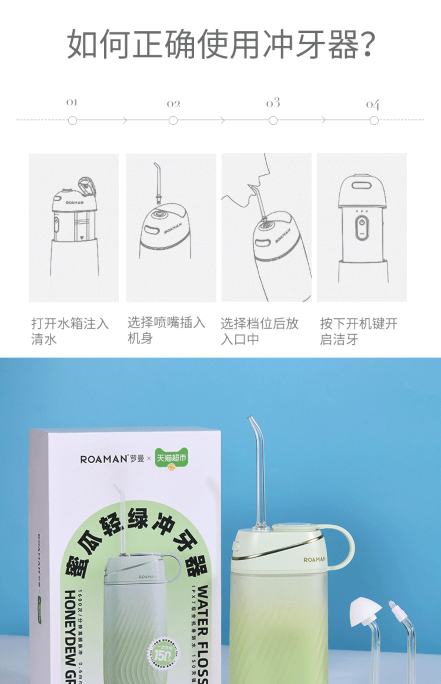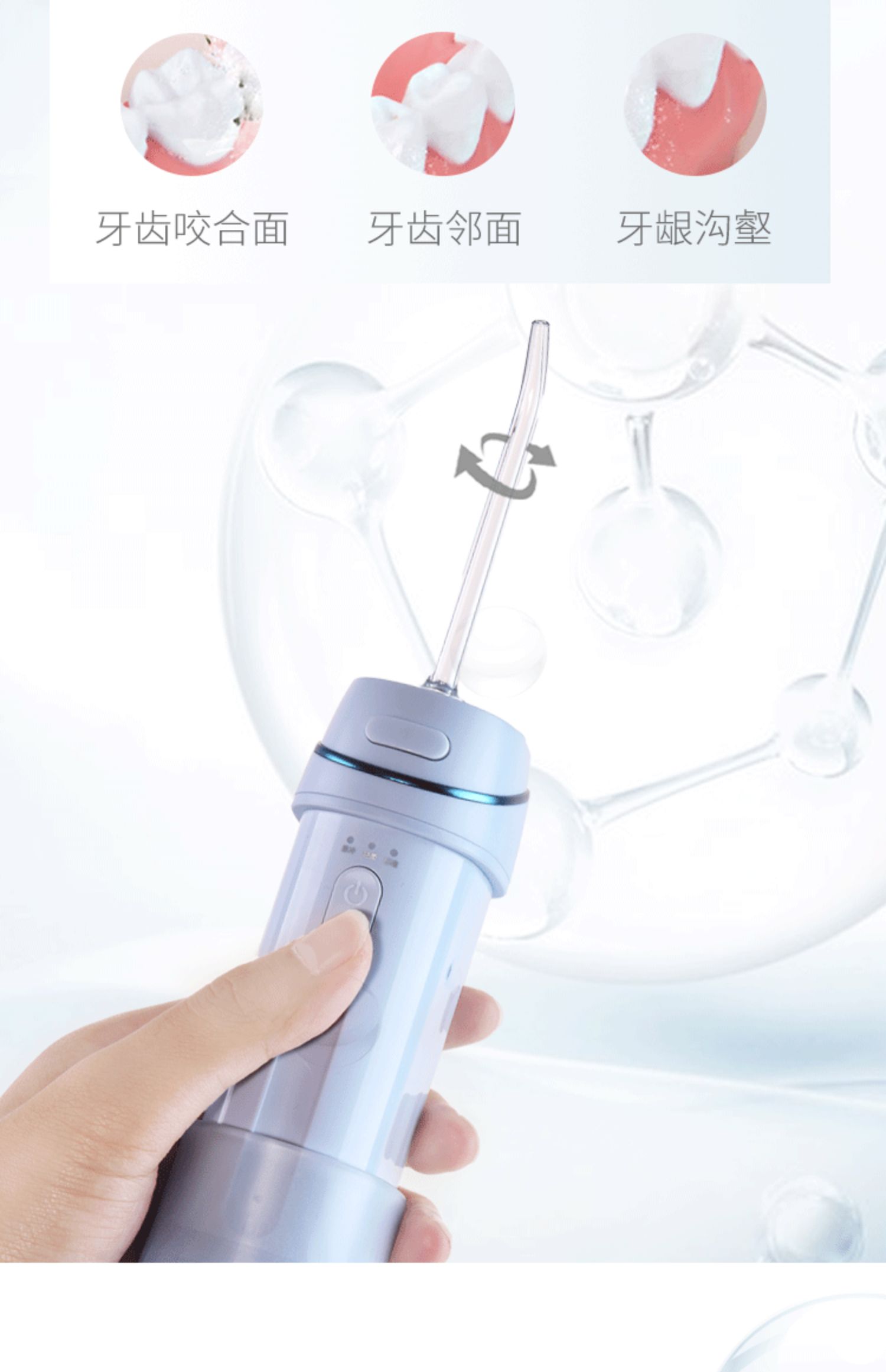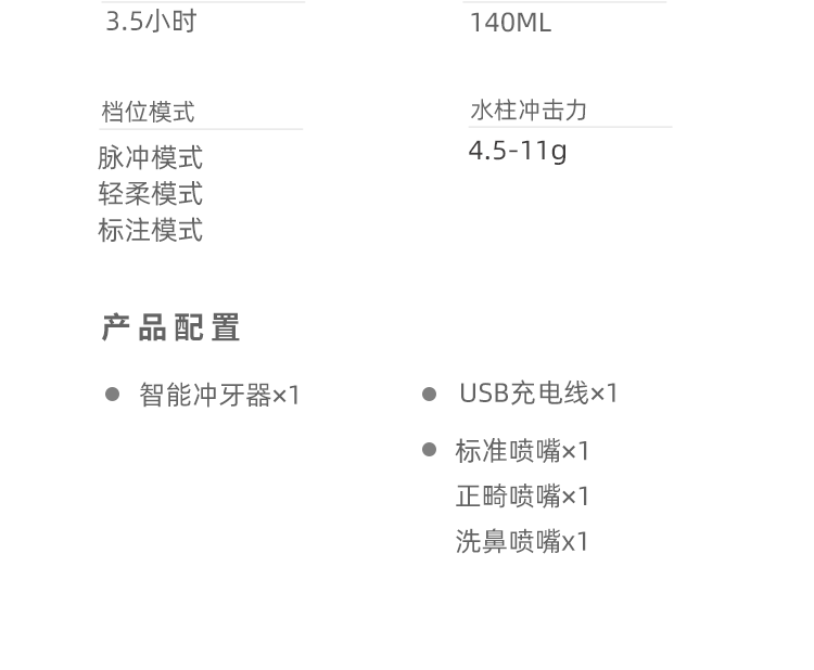 1.1600次/分高頻脈沖,0.6mm細膩水柱 2.3種私藏模式,4.5-11g溫柔水壓,柔軟體驗 3.可360°旋轉噴嘴,采用FDA食品級材質,1分鐘智能計時 4.擁有140ml水箱,輕松使用 5.IPX7級全身水洗,可淋浴 6.磁吸式感應充電 ,超長續航45天