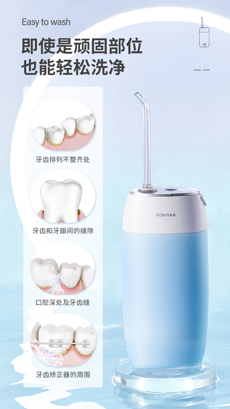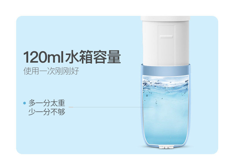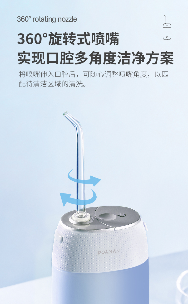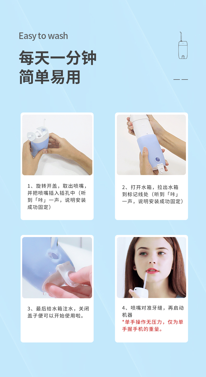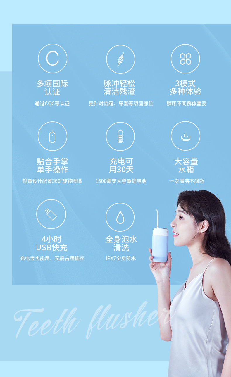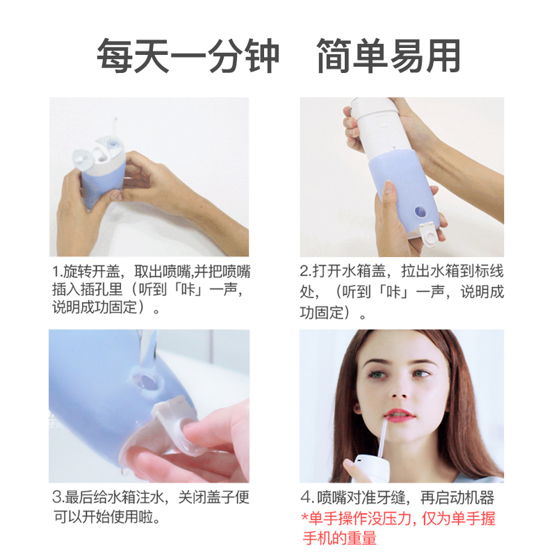 1.3種模式(標準|輕柔|脈沖) 2.1600次/分高頻脈沖高效潔力 3.360°可旋轉噴嘴、 FDA食品級材質,1分鐘智能計時 4.120ml迷你水箱,小巧適用 5.IPX7級全身水洗設計,通用USB充電接口 6.110-240V全球通用電壓,充電隨行,旅行無憂 7.30天超長續航時間