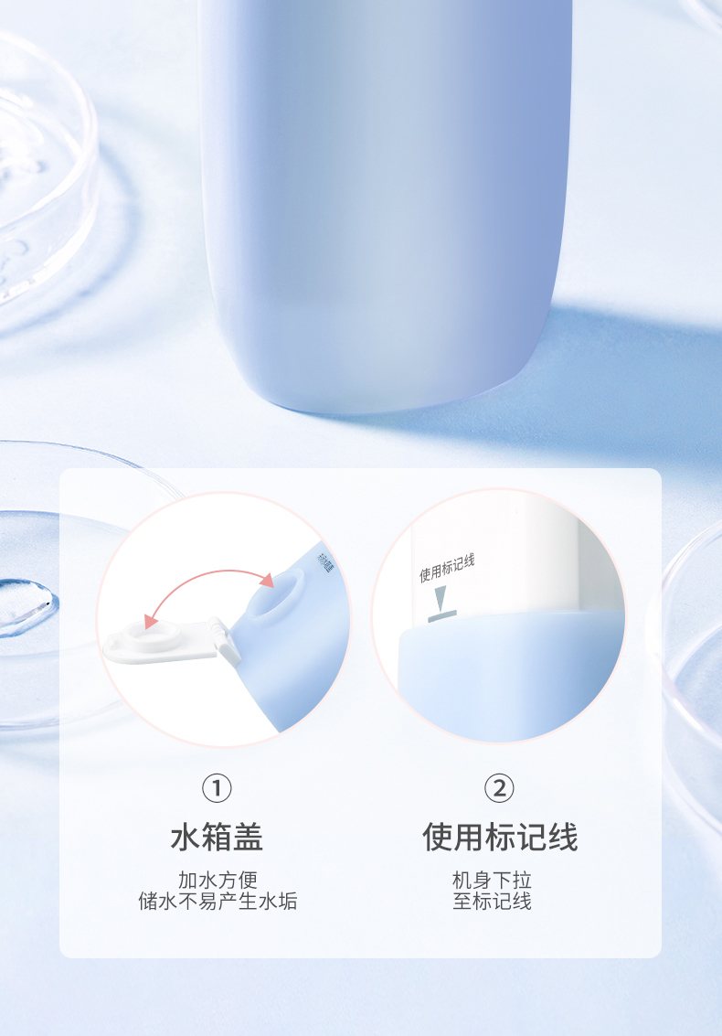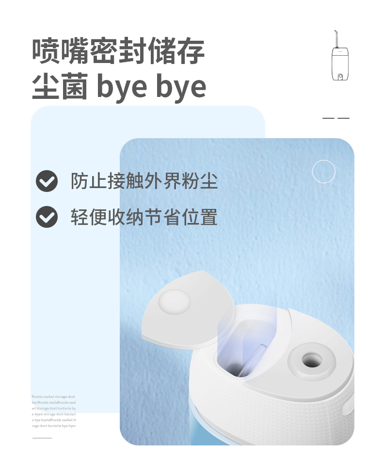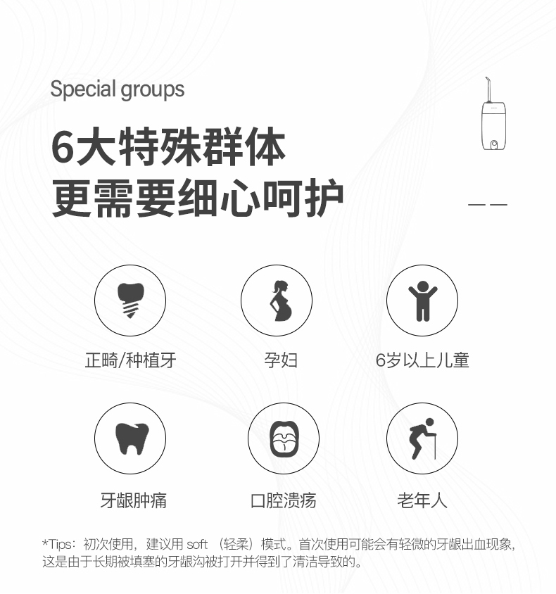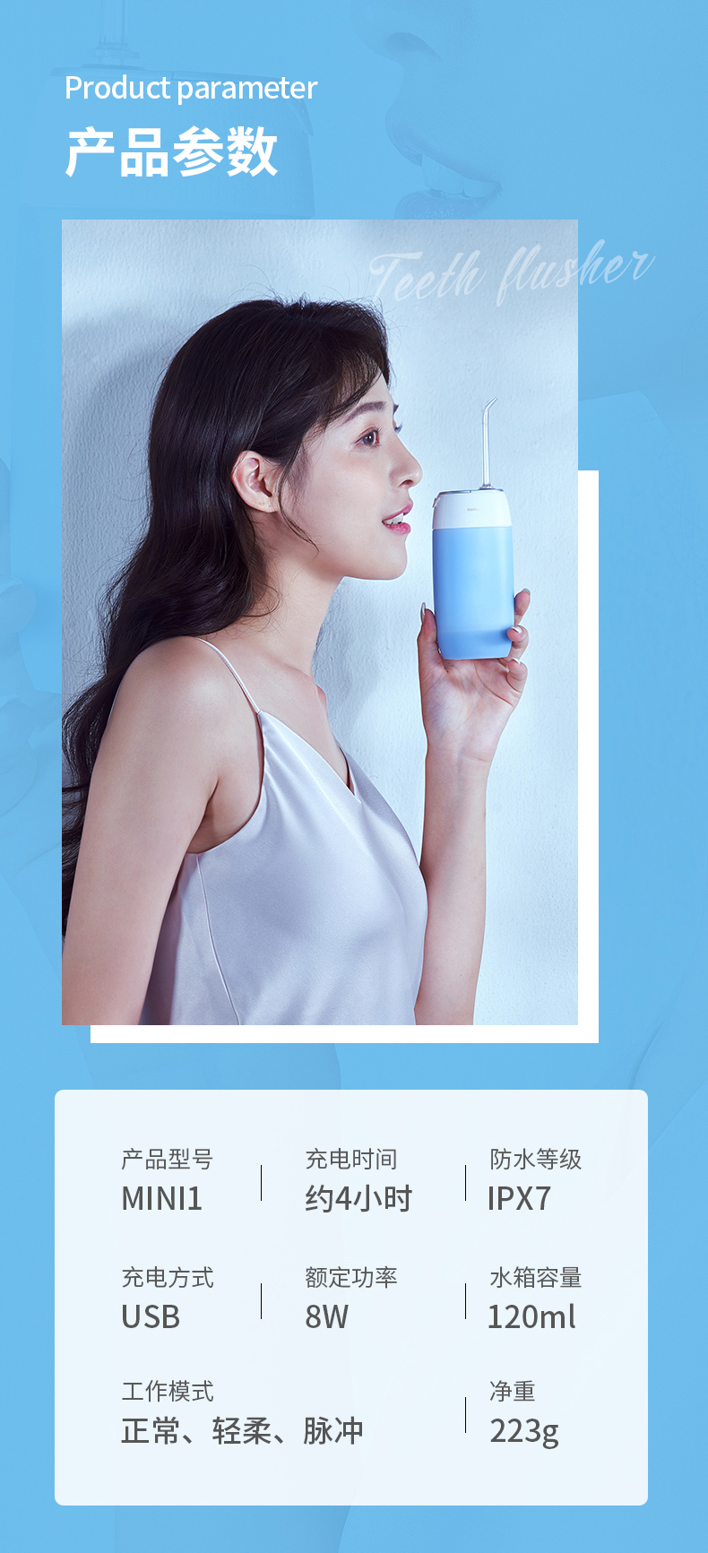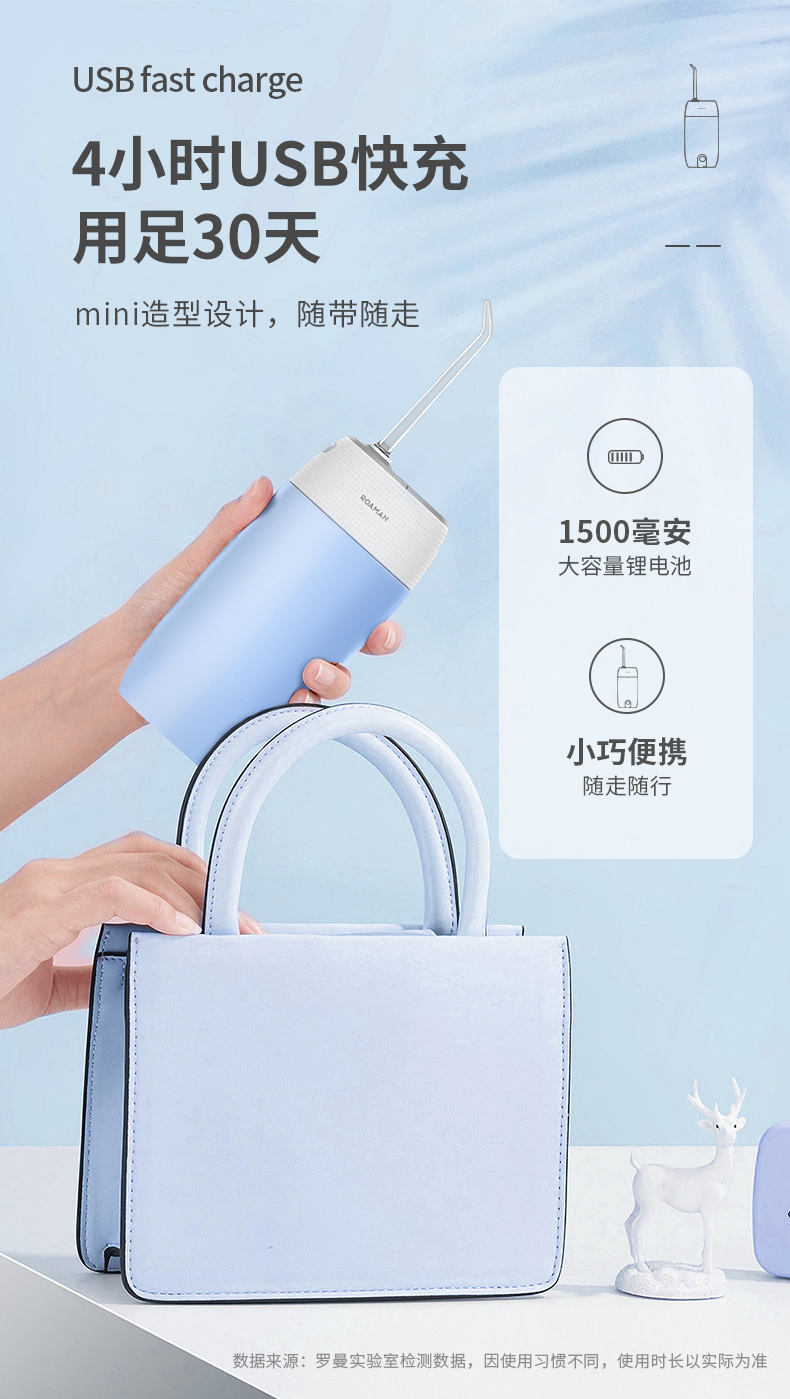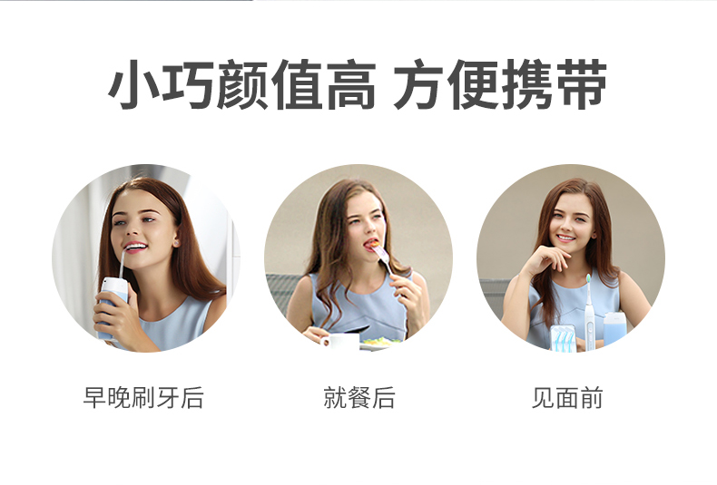 1.3種模式(標準|輕柔|脈沖) 2.1600次/分高頻脈沖高效潔力 3.360°可旋轉噴嘴、 FDA食品級材質,1分鐘智能計時 4.120ml迷你水箱,小巧適用 5.IPX7級全身水洗設計,通用USB充電接口 6.110-240V全球通用電壓,充電隨行,旅行無憂 7.30天超長續航時間