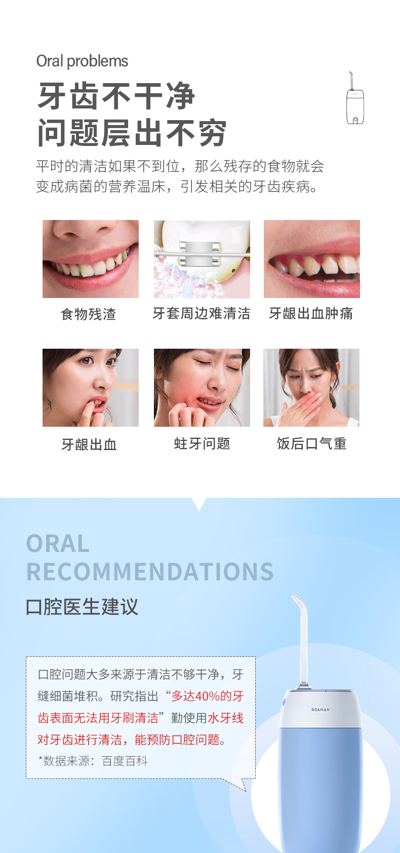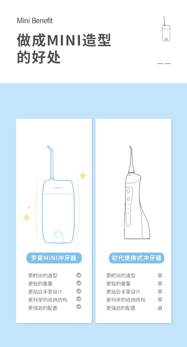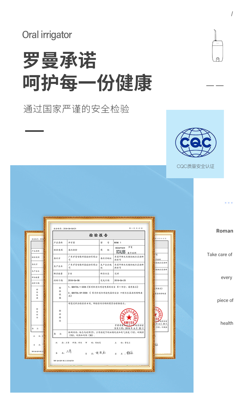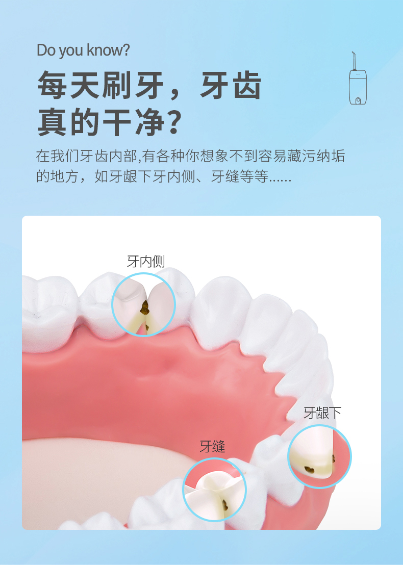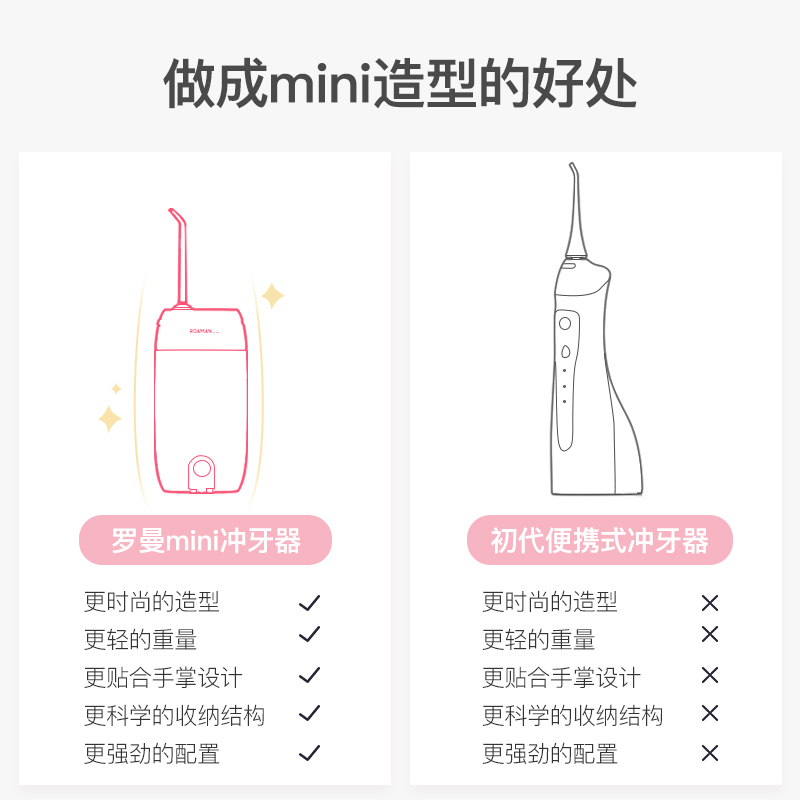 1.3種模式(標準|輕柔|脈沖) 2.1600次/分高頻脈沖高效潔力 3.360°可旋轉噴嘴、 FDA食品級材質,1分鐘智能計時 4.120ml迷你水箱,小巧適用 5.IPX7級全身水洗設計,通用USB充電接口 6.110-240V全球通用電壓,充電隨行,旅行無憂 7.30天超長續航時間