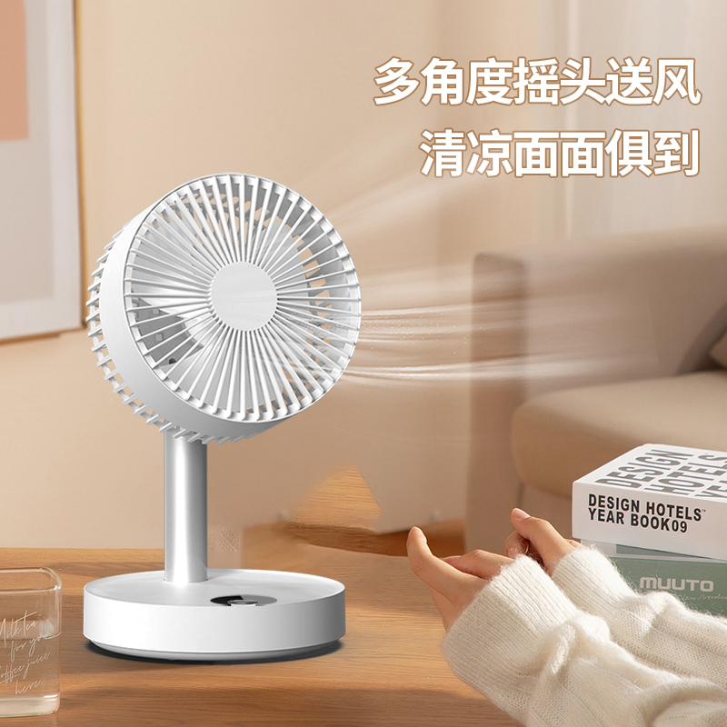 "五檔風力調節,對流式循環換風 采用靜音無刷電機,輕音送風 左右120度自動搖頭,上下90度可調 遠距離遙控,支持開關、調風、搖頭、燈光控制 智能數顯,伸縮設計,可落地可桌面使用 內置大容量鋰電池,可隨身攜帶使用"