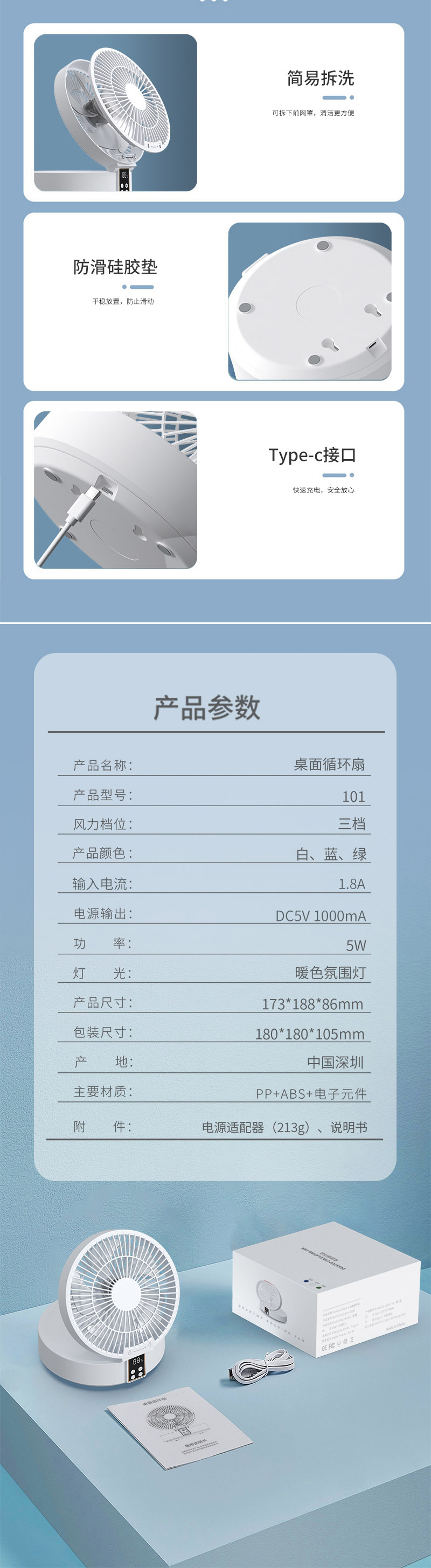 "折疊設(shè)計(jì),可桌面、可掛壁使用 三檔風(fēng)力調(diào)節(jié),對(duì)流式循環(huán)換風(fēng) 采用靜音無刷電機(jī),輕音送風(fēng) 遠(yuǎn)距離遙控,智能數(shù)顯,溫馨氛圍燈 內(nèi)置大容量鋰電池,可隨身攜帶使用"