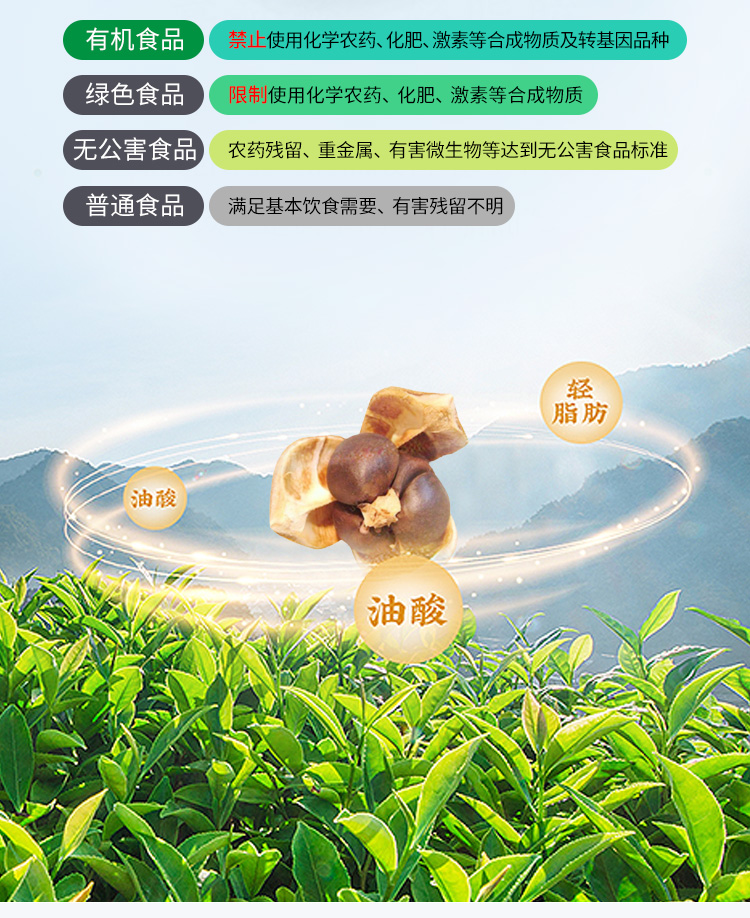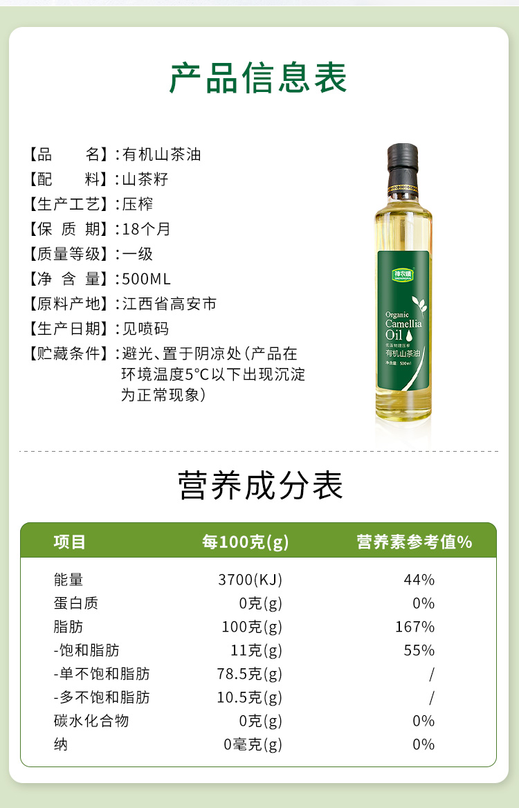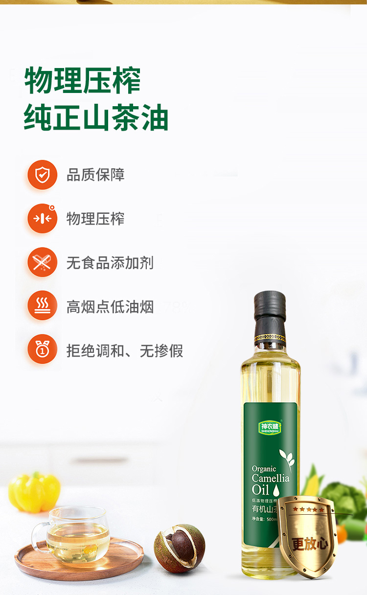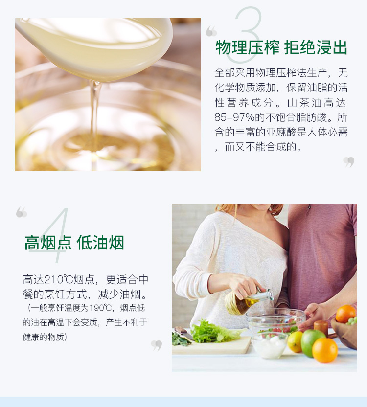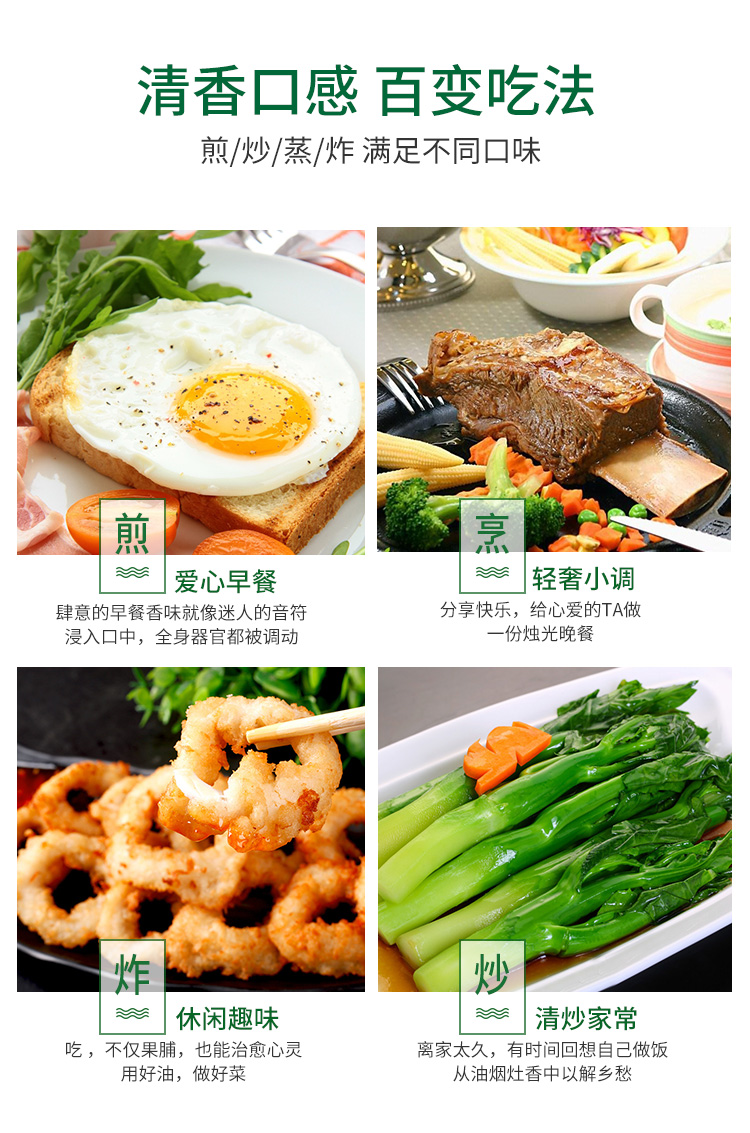 高煙點(diǎn)少油煙、單不飽和脂肪酸高、營(yíng)養(yǎng)價(jià)值豐富、東方液體黃金、高端食用油