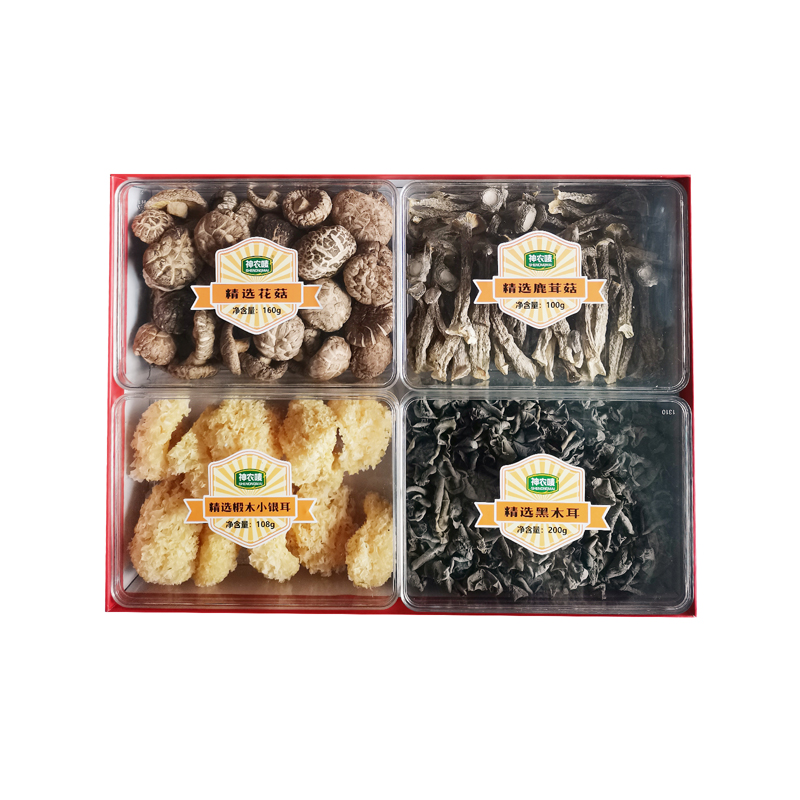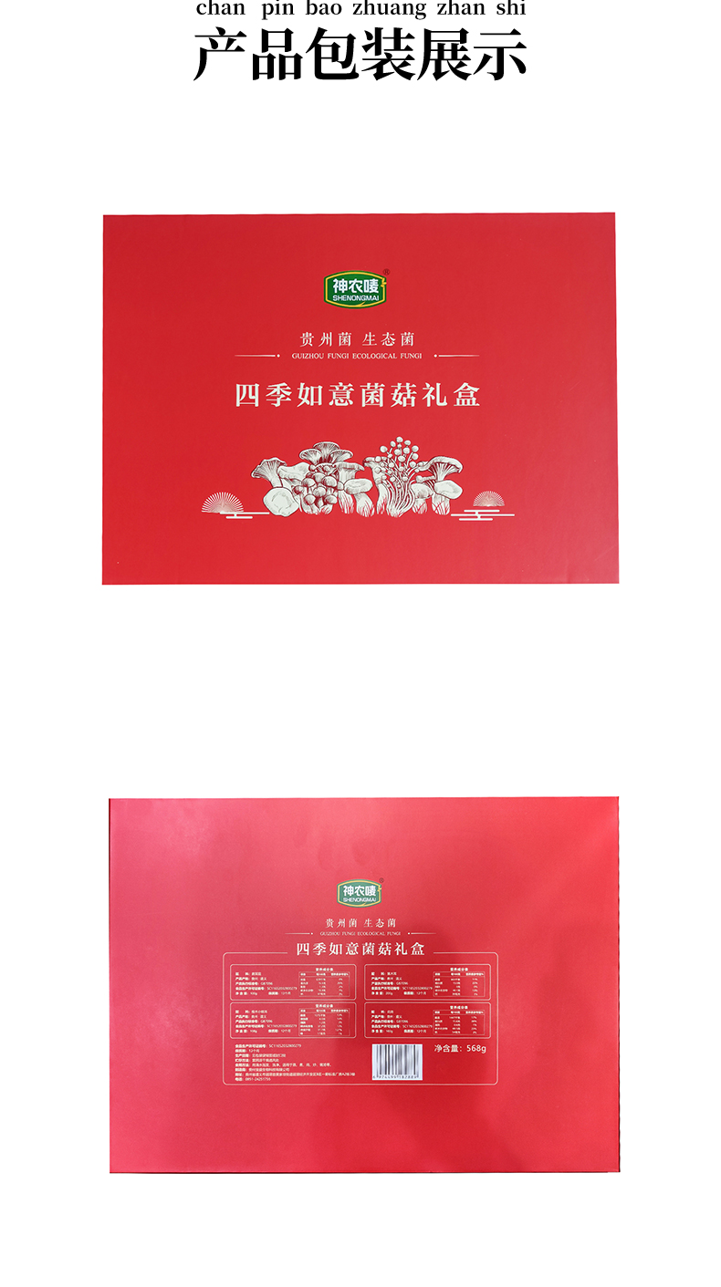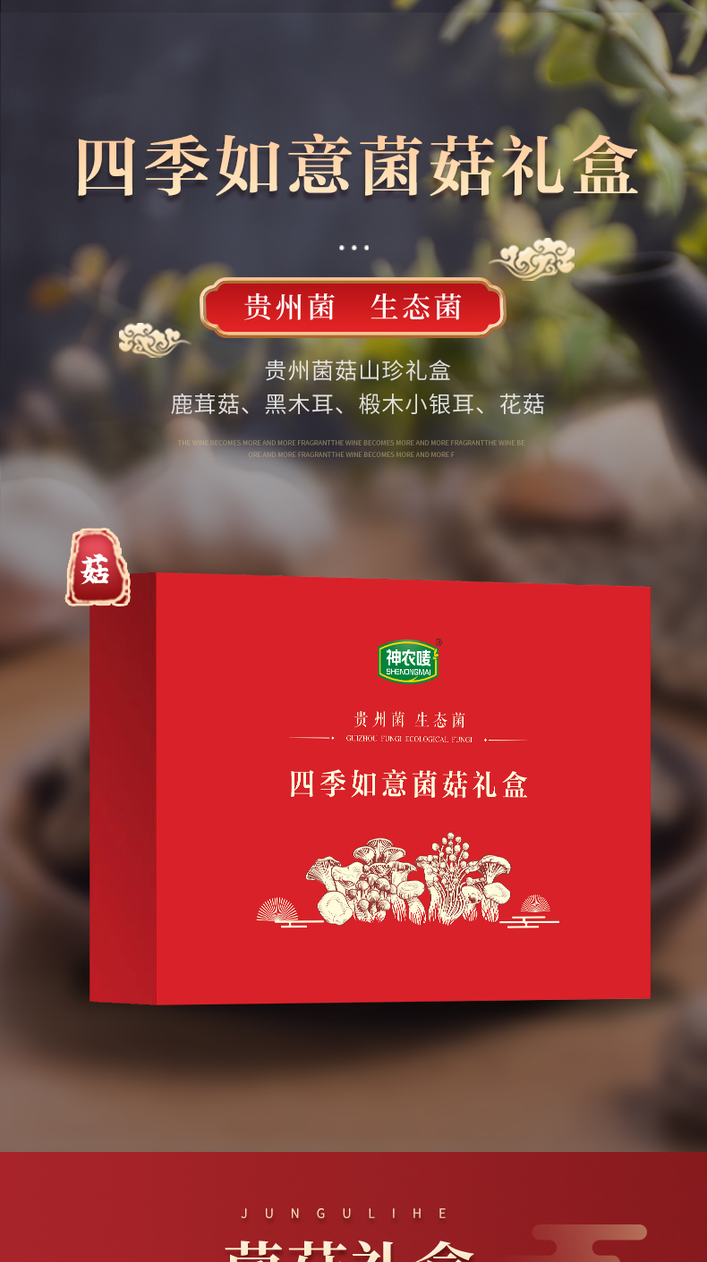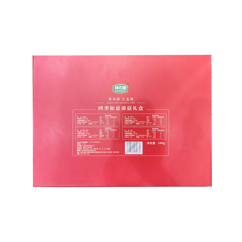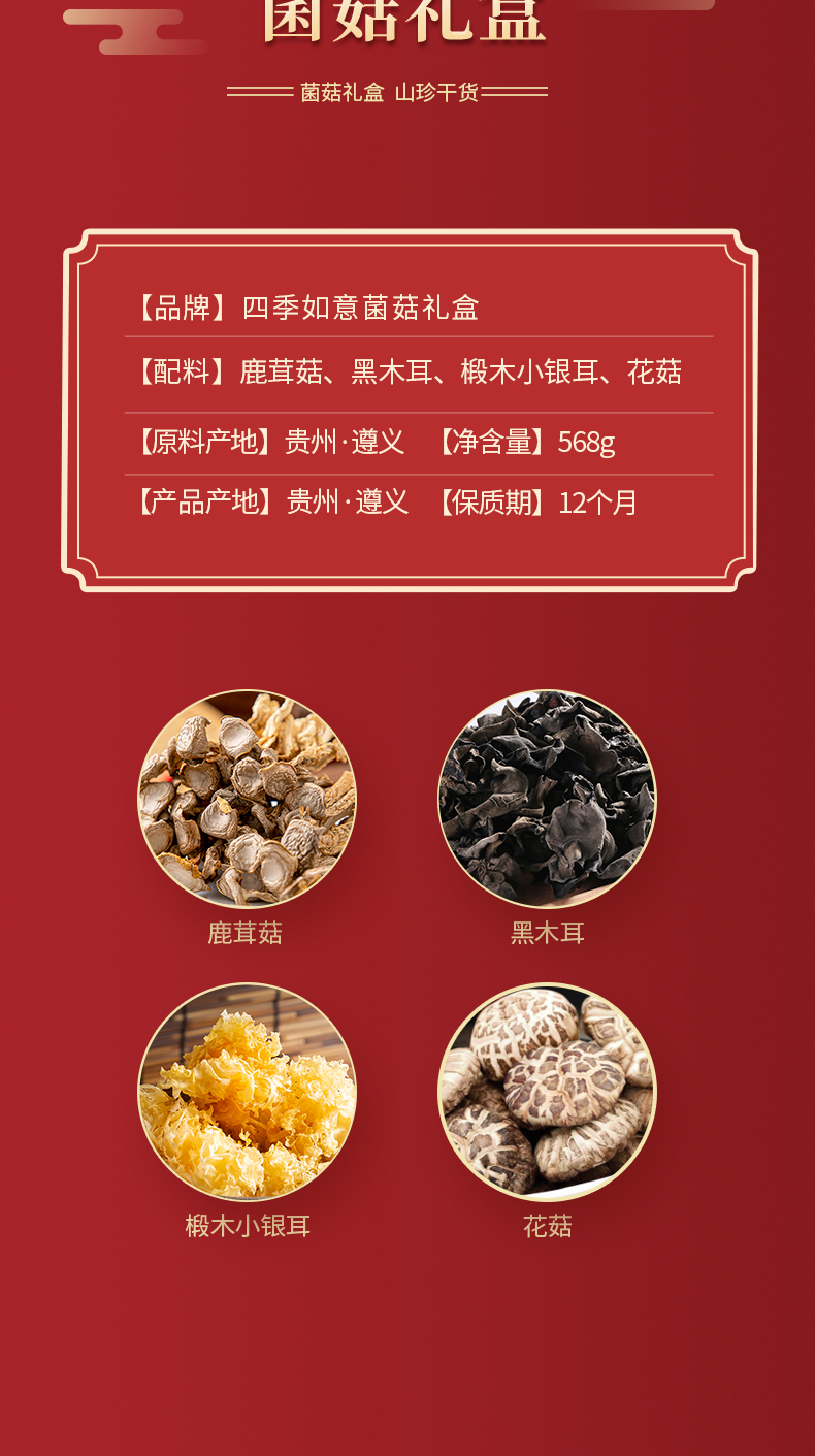 貴州精選菌菇禮盒、禮盒內(nèi)容物(鹿茸菇100g,黑木耳200g,椴木小銀耳108g,花菇160g) 紅色大氣手提禮盒裝、送禮更體面