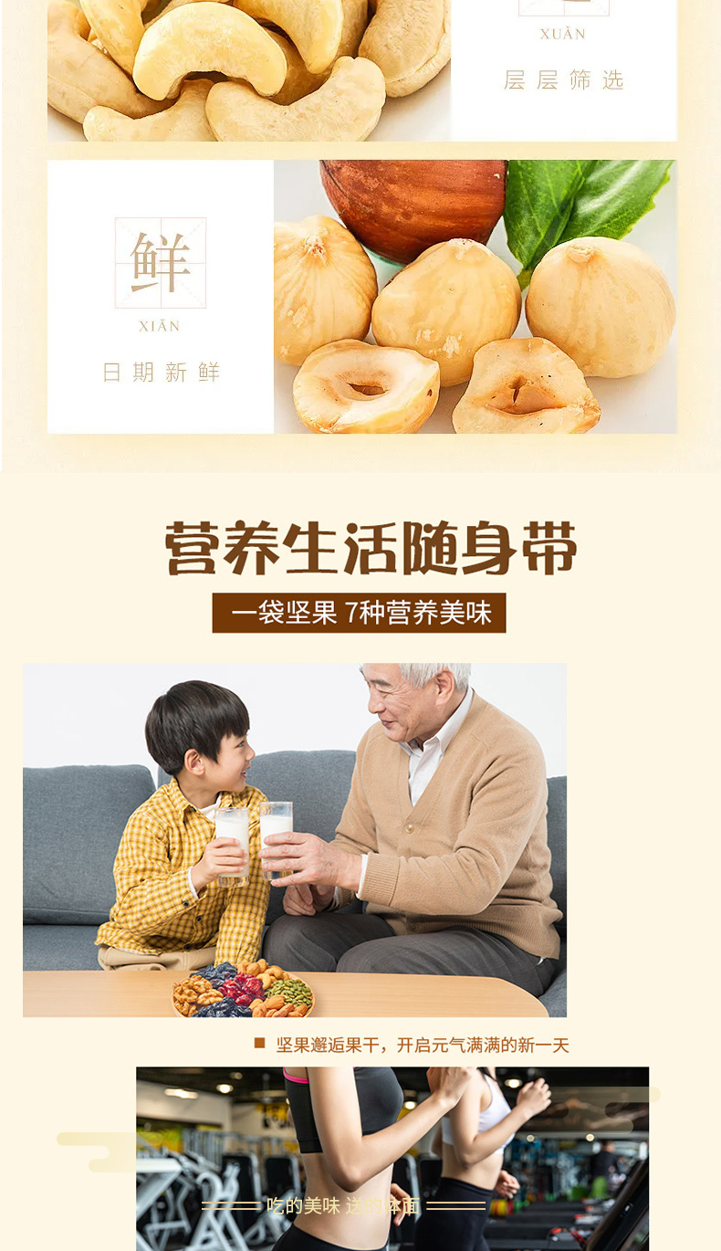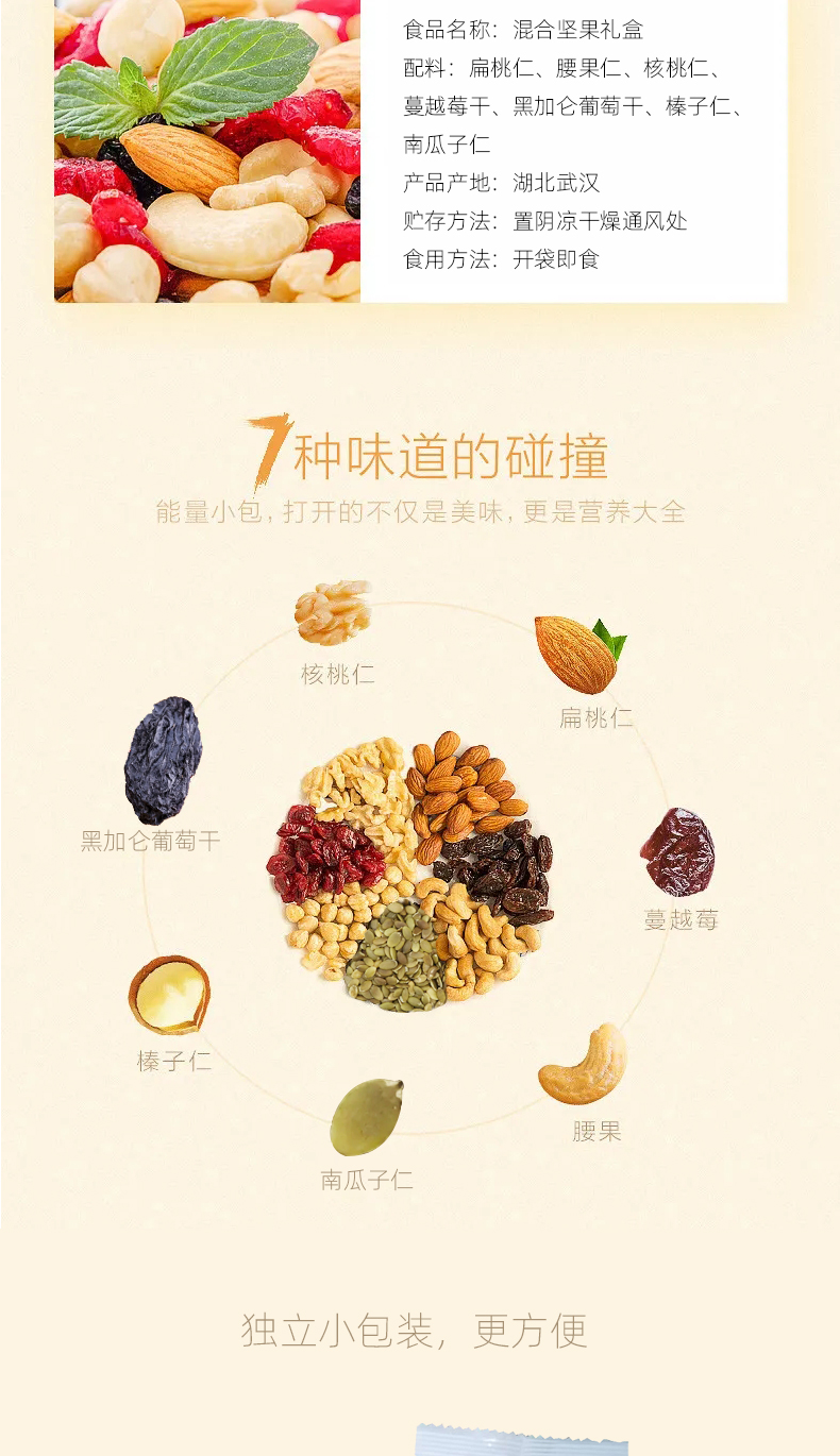 25g*30包獨立包裝,混合堅果:(榛子仁、扁桃仁、腰果仁、核桃仁、南瓜子仁、蔓越莓干、黑加侖葡萄干) 堅果零食禮盒、節(jié)日送禮禮盒