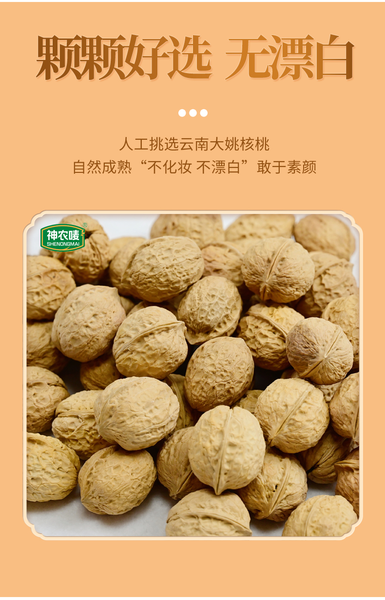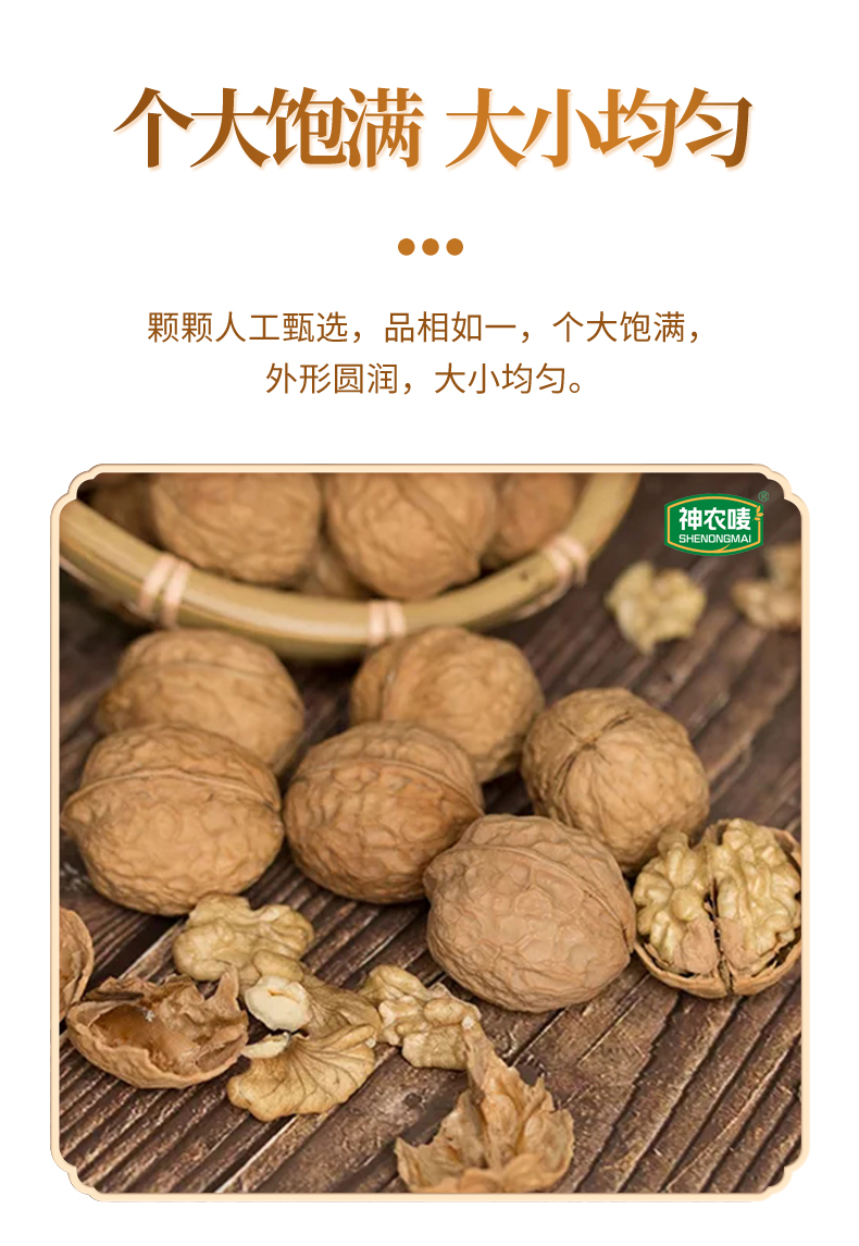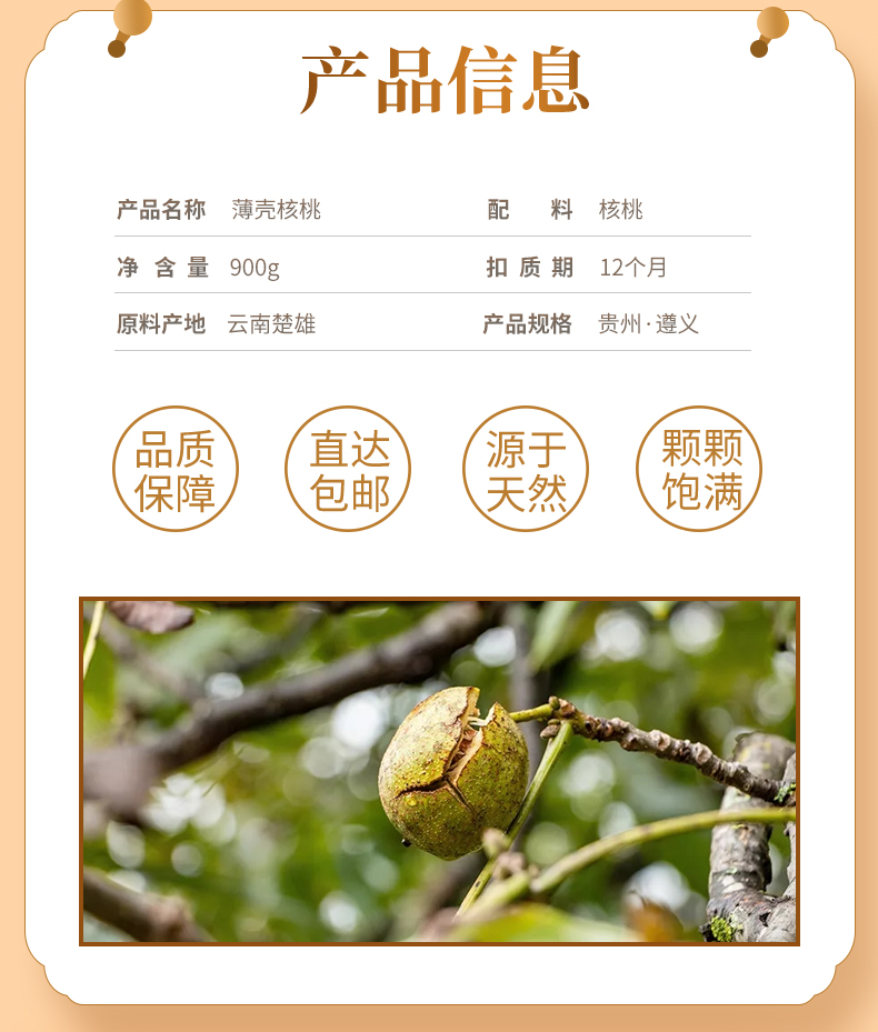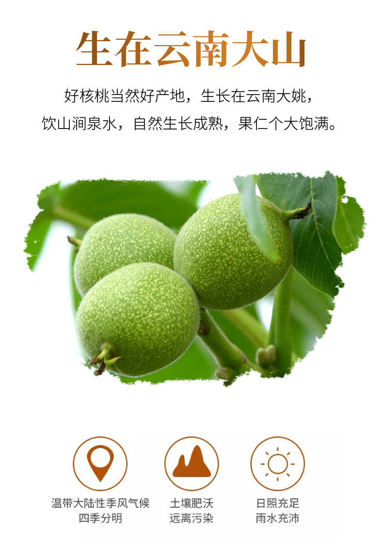 原料產地貴州、云南有機種植基地的薄殼核桃、果粒均一,無苦不澀、清香回甜。