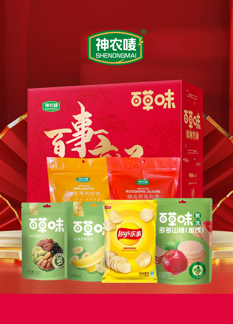 禮盒(神農嘜薄殼核桃500g 、神農嘜若羌灰棗500g、百草味多多葡萄干100g 、百草味多多山楂200g、樂事經典原味70g、百草味香蕉脆片85g) 節日送禮禮盒