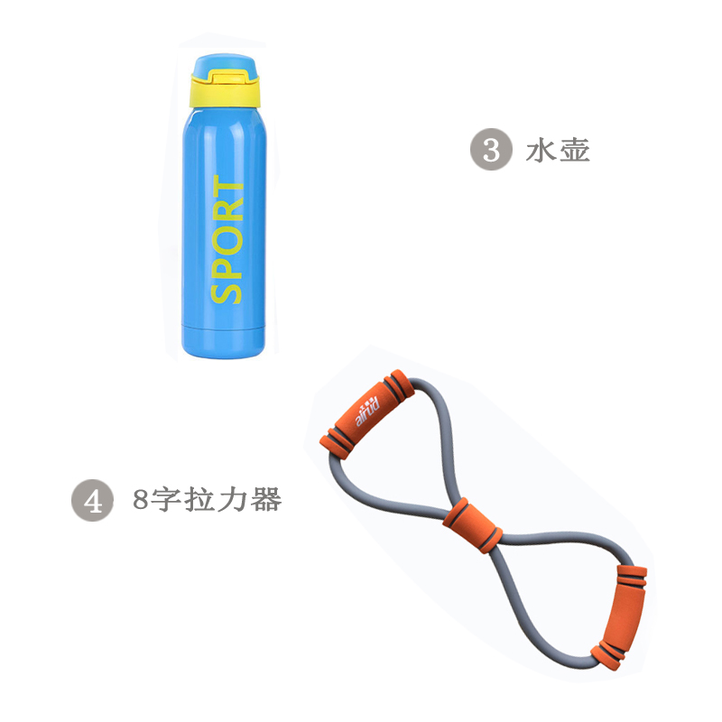 產品說明:跳繩1條、8字拉力器1條、護腕一對,頭帶1條、杯子一個、防水包一個產品介紹:包裝采用牛津布可多次反復使用方便攜帶,全套的簡易健身器材,為您的生活增添更多的快樂!