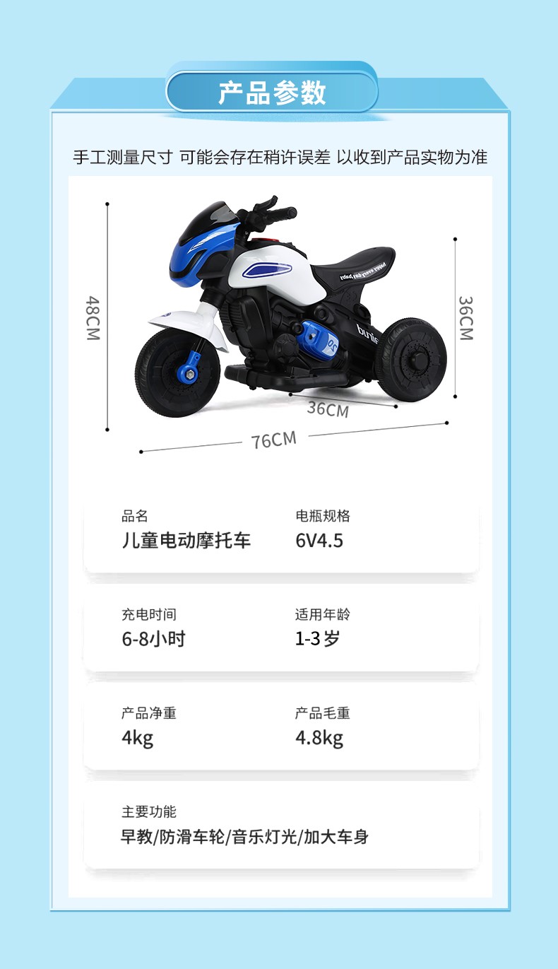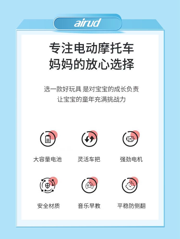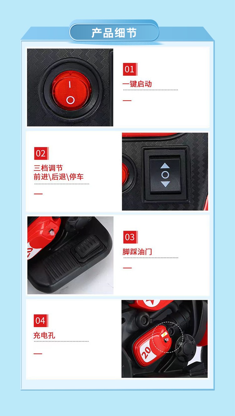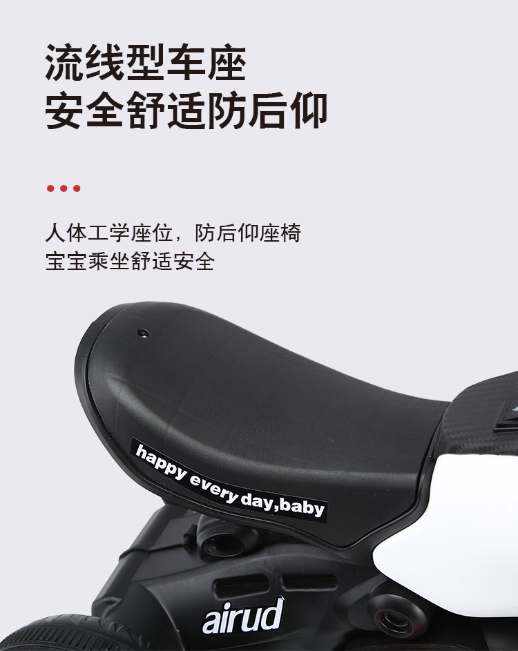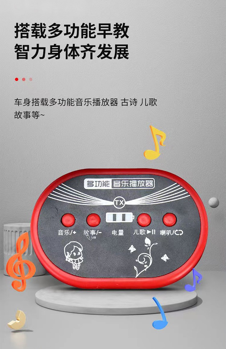 流線外觀設計,仿真汽車踏板輕便簡單易學、三檔調節,內置多首兒童歌曲、人性化舒適座椅設計,加寬加大,有效增加寶寶的舒適感,內置燈光音樂讓寶寶童趣無限,快樂成長,方向盤環保材質制作,邊緣設計,保護寶寶嫩嫩的小手不受傷害,防滑靜音輪,適合各種不同路況