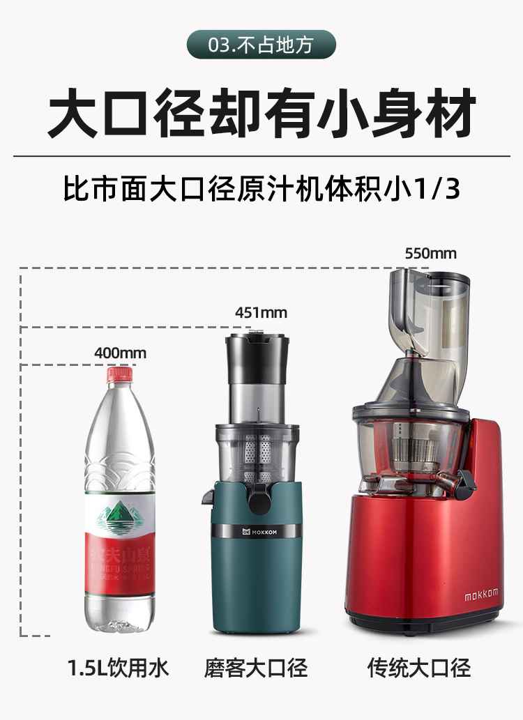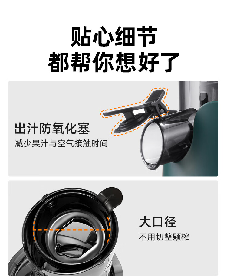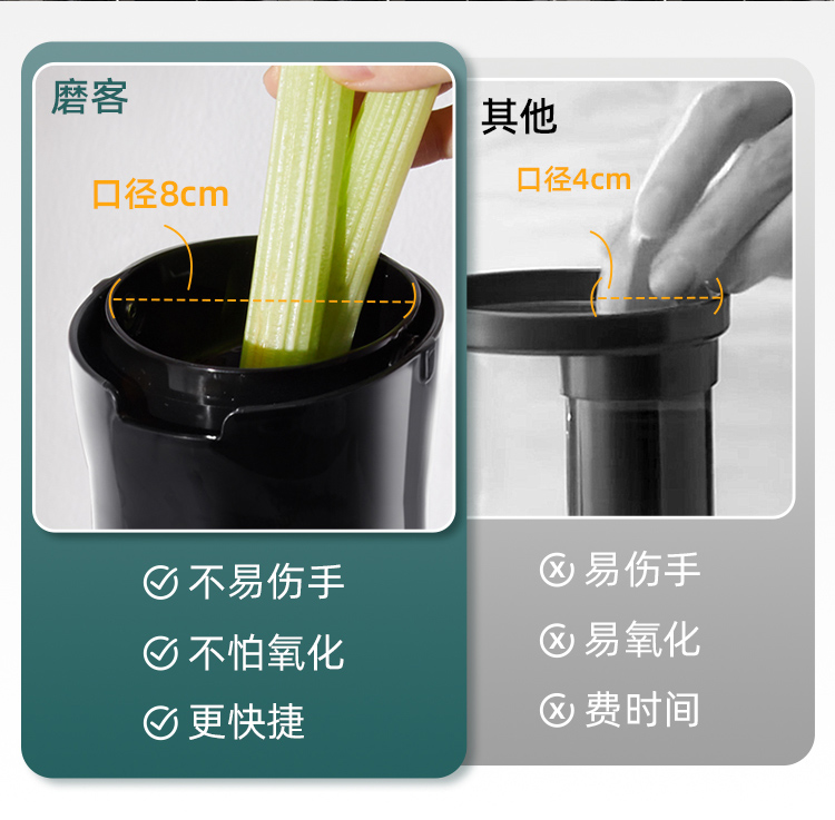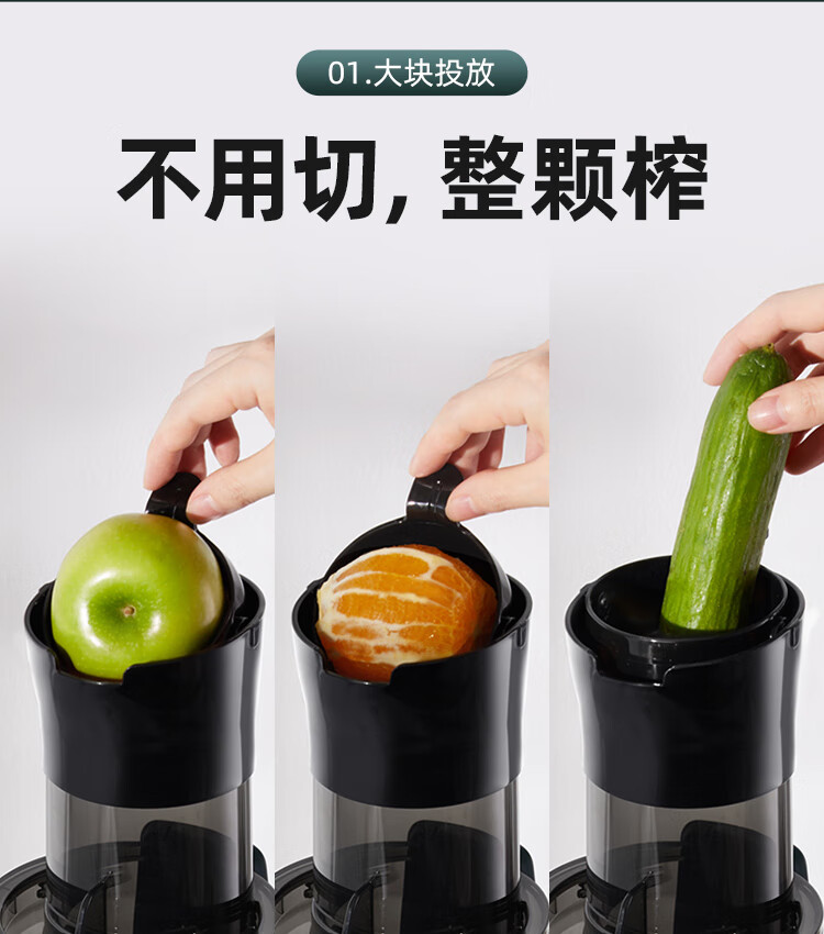9cm直徑大口徑,不用切,整顆榨,大塊投放真方便,不切小塊防氧化又安全