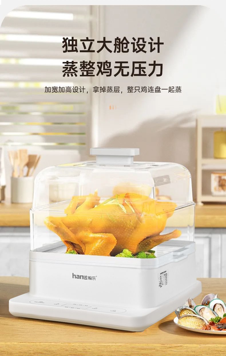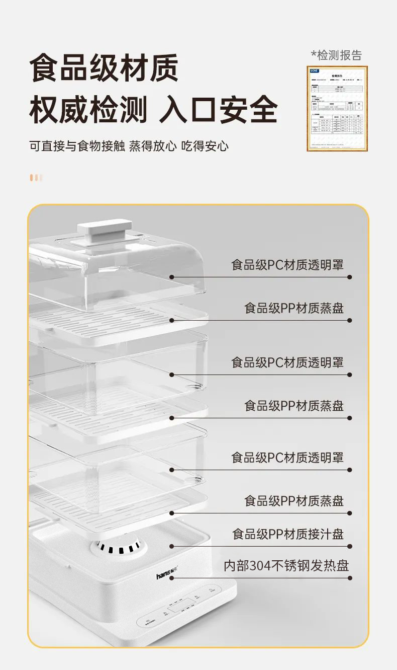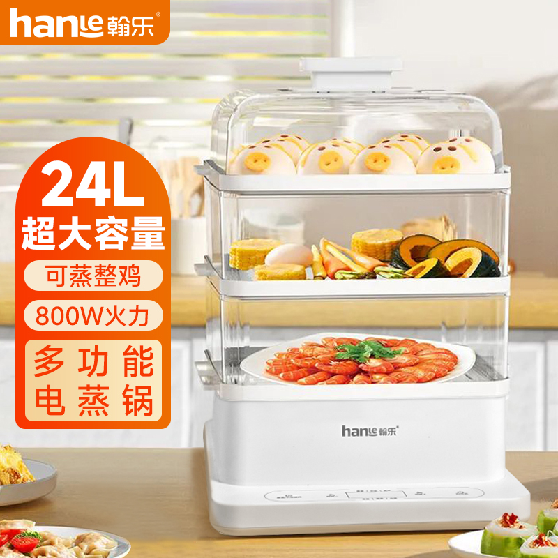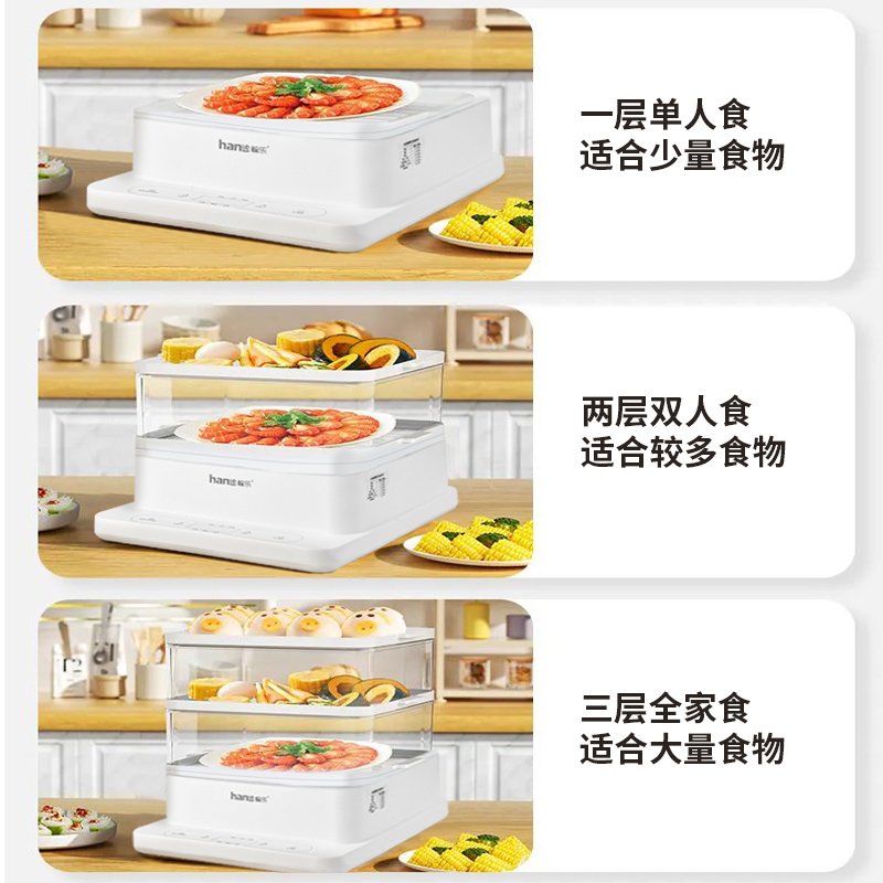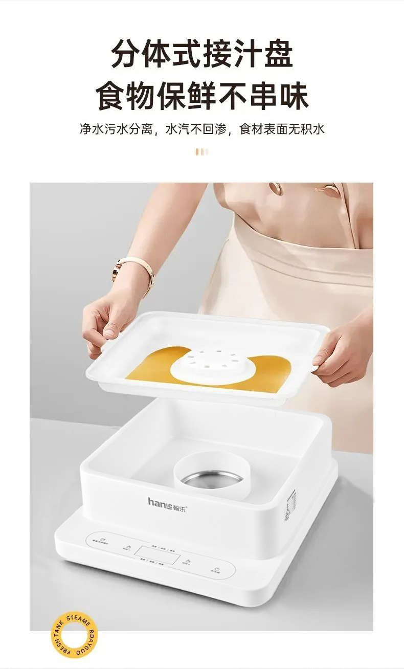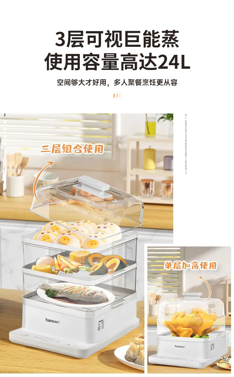 多功能電蒸鍋,360°可視,總容量高達24L,分層蒸不串味,聚能噴發蒸汽,凈水污水分體設計,易清潔更省心,防干燒保護,免看管更安全,可視化機身,烹飪看得見,24h預約+12h保溫,加寬加高設計,可整只雞連盤一起蒸,可容下9個包子左右充分利用邊邊角角,分體式接汁盤,操作界面簡潔,方便操作,缺水自動斷電,不怕干燒,智能溫控保護,折疊收納,更省空間,觸控預約,蒸籠材質:食品級PC材質,蒸隔材質食品級PP材質,發熱盤材質食品級304不銹鋼
