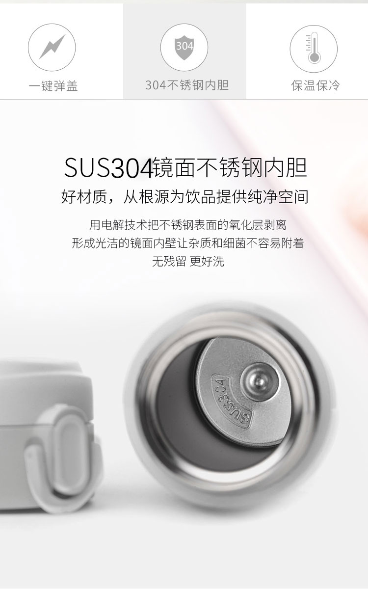 一鍵彈蓋,304不銹鋼內膽,耐用防漏水,長效保溫,經典高顏值