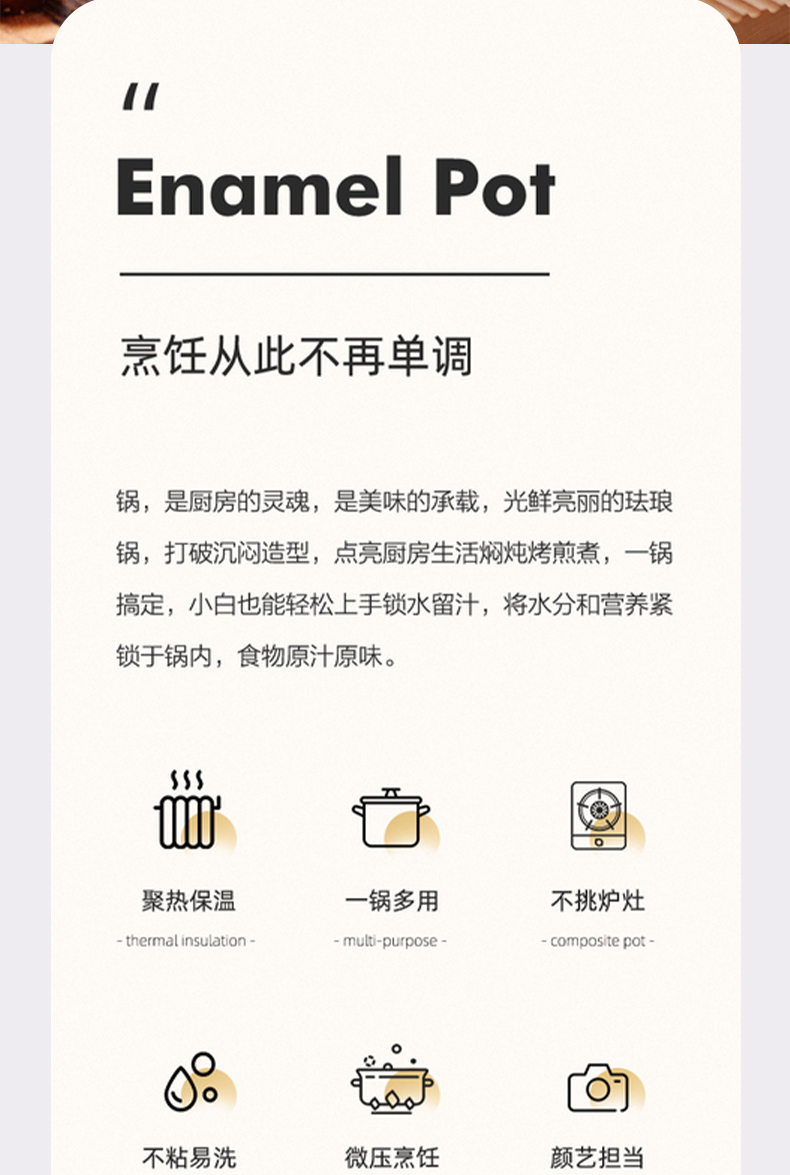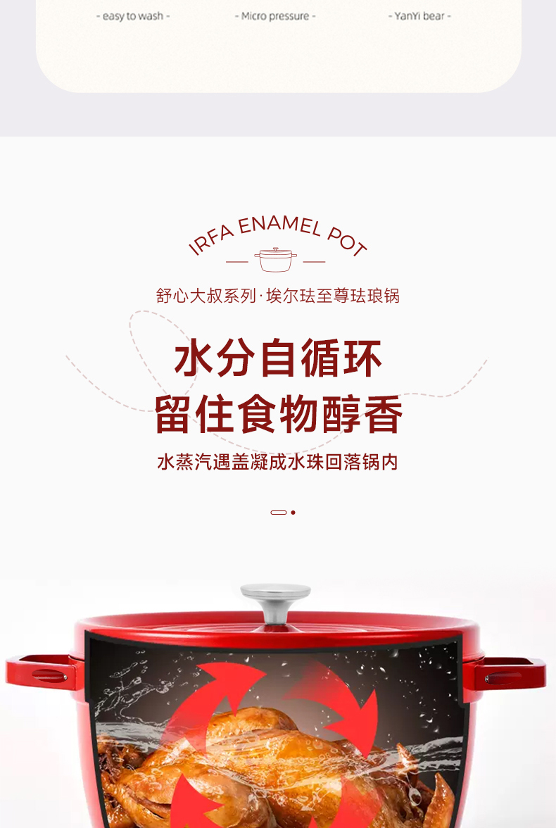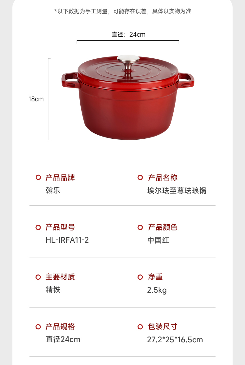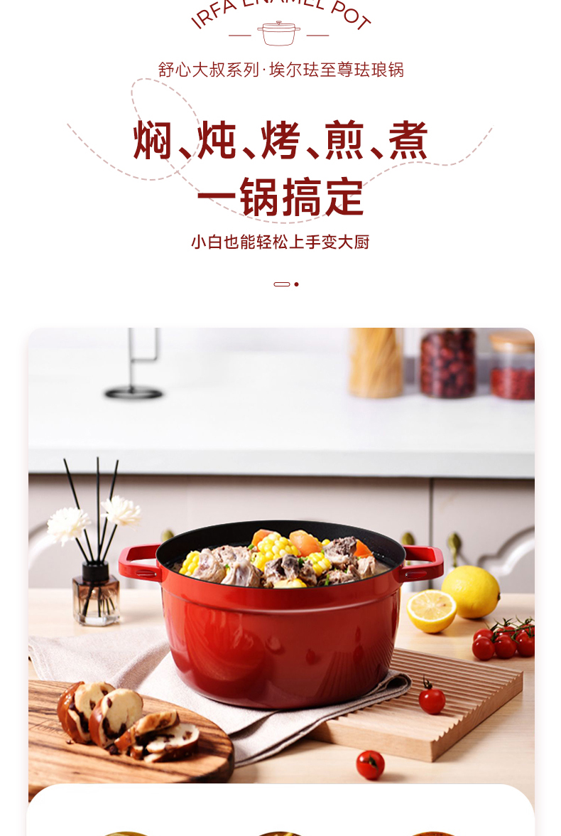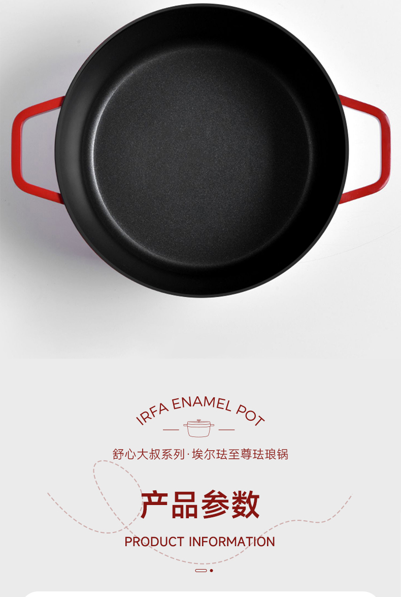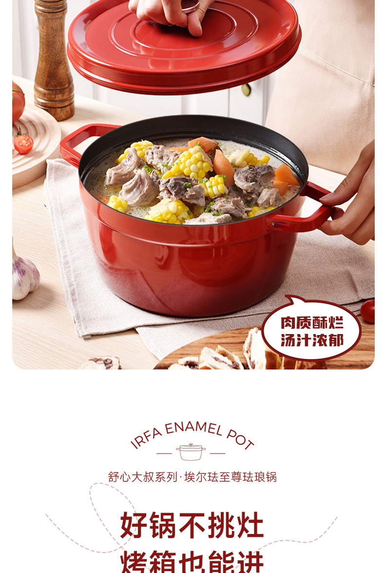 埃爾法至尊琺瑯鍋大容量雙色可選,滿足家庭日常所需,聚熱保溫鍋內水分自循環,一鍋多用,不挑爐灶,不粘易清洗,微壓烹飪,直徑約24cm,高度約18cm,精鐵材質,2.5kg