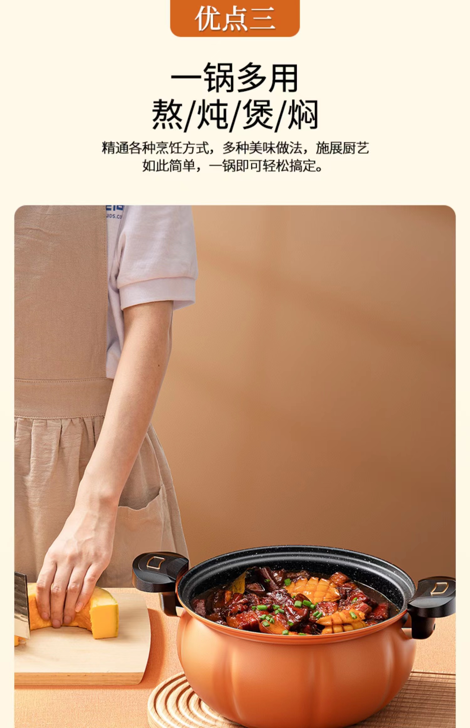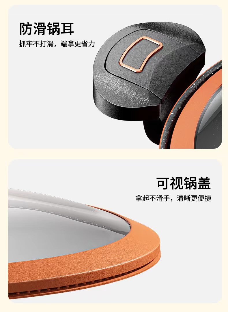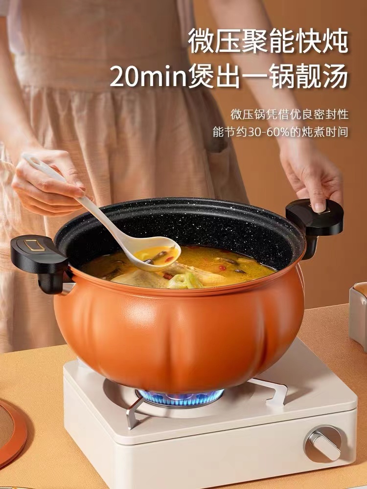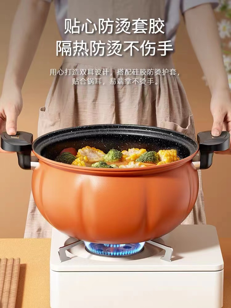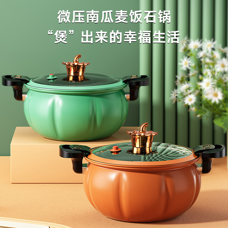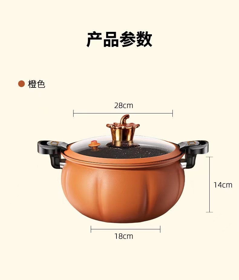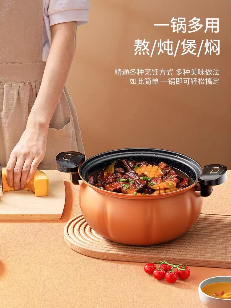 高顏值優質精鐵麥飯石不粘鍋,便捷開蓋設計帶微壓功能,南瓜設計一鍋多用,輕煙少油