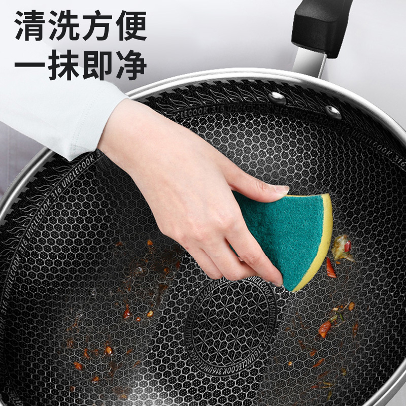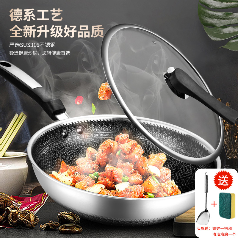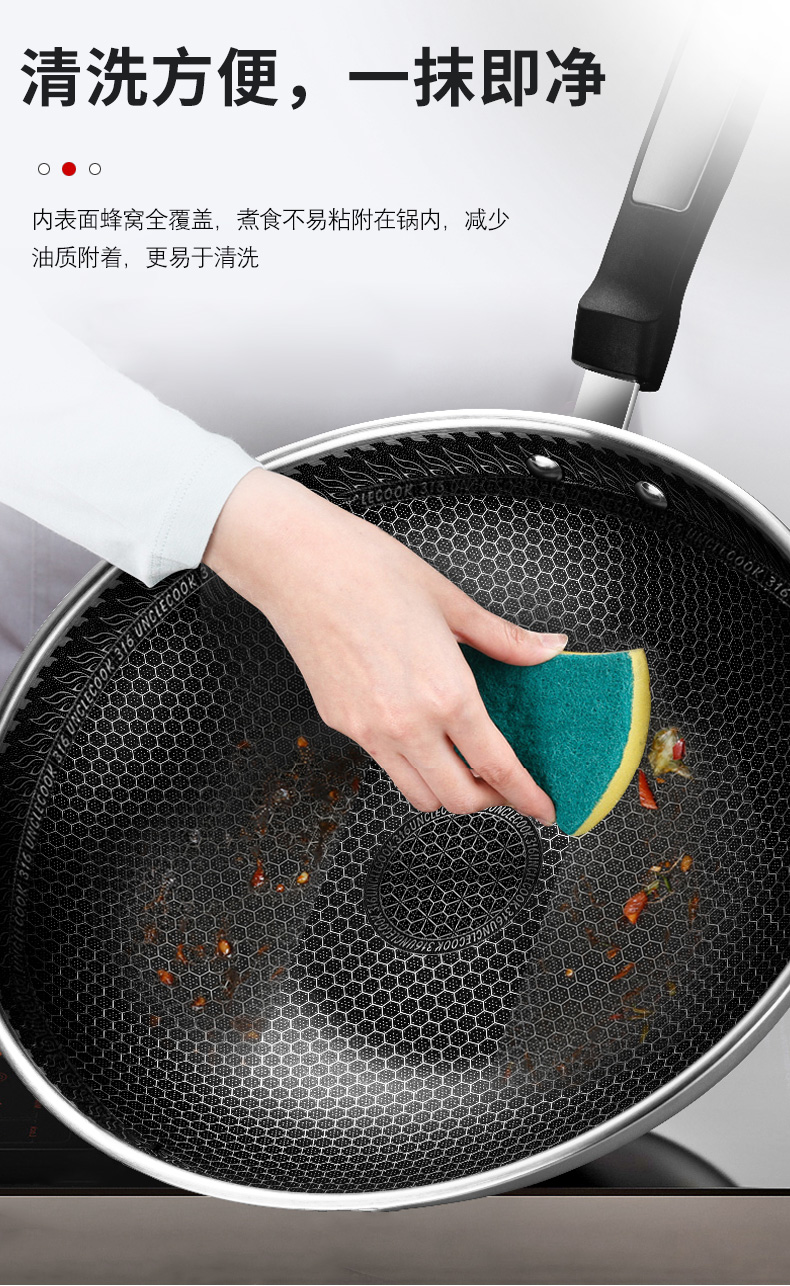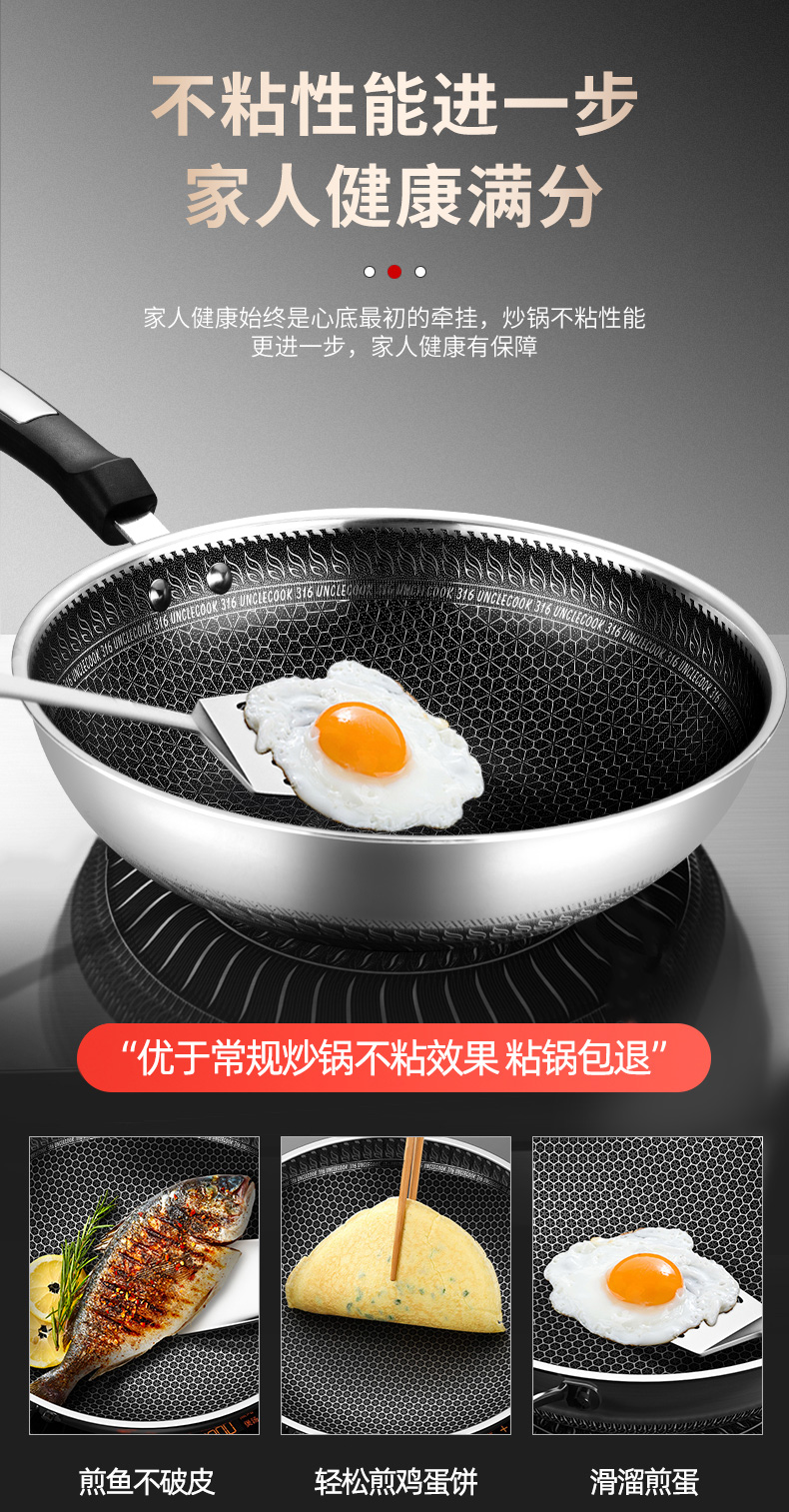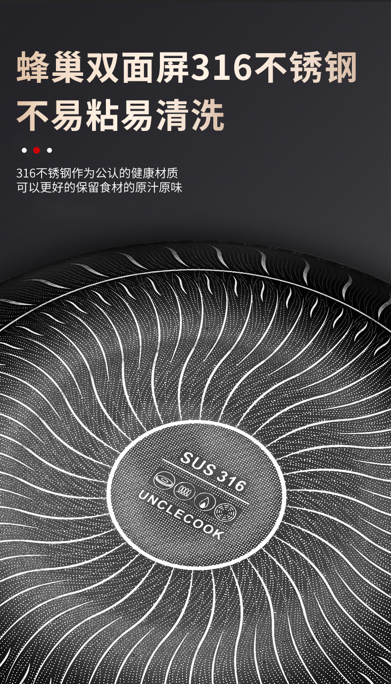 316不銹鋼,蜂窩設計物理不粘,無涂層可用鋼鏟,不糊底更耐刮,煤氣電磁爐通用
