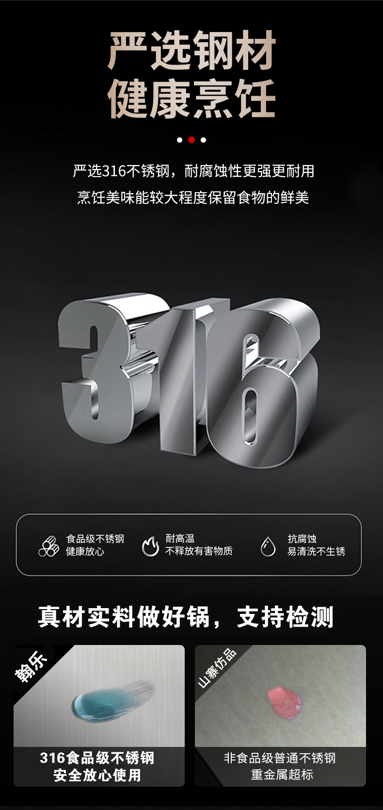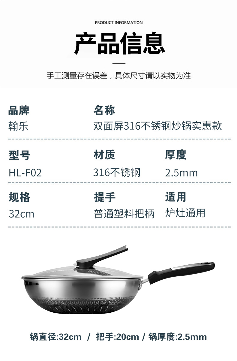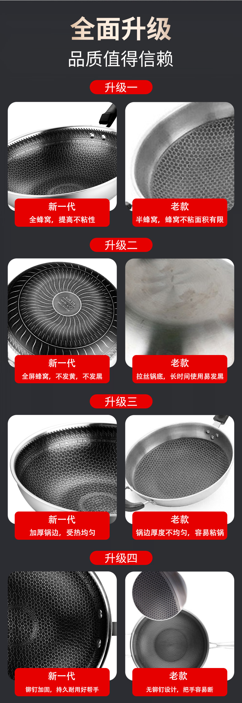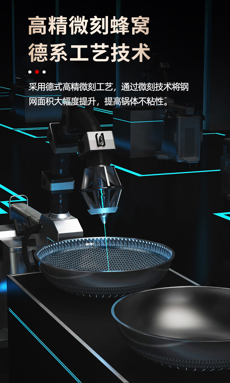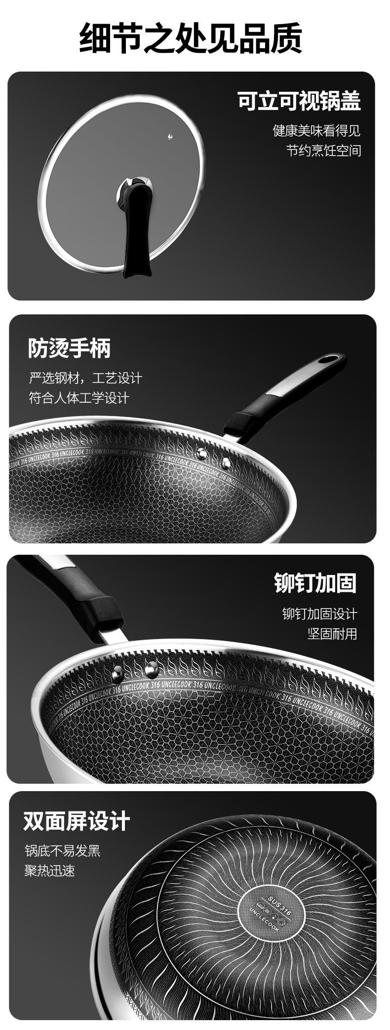 316不銹鋼,蜂窩設計物理不粘,無涂層可用鋼鏟,不糊底更耐刮,煤氣電磁爐通用