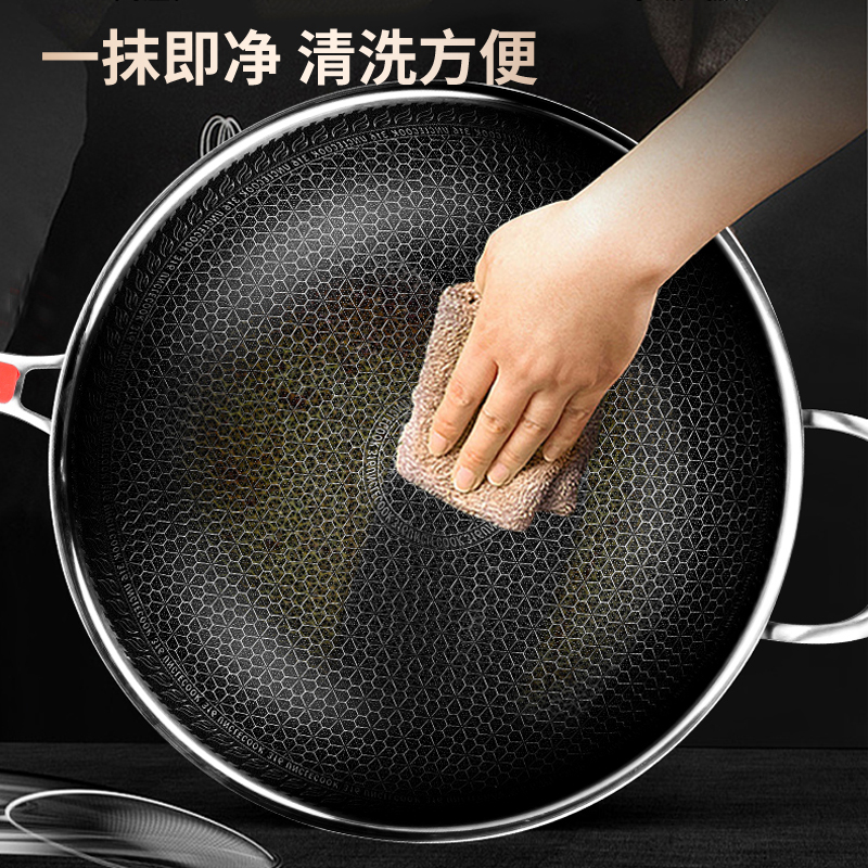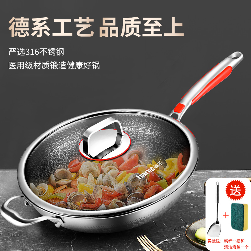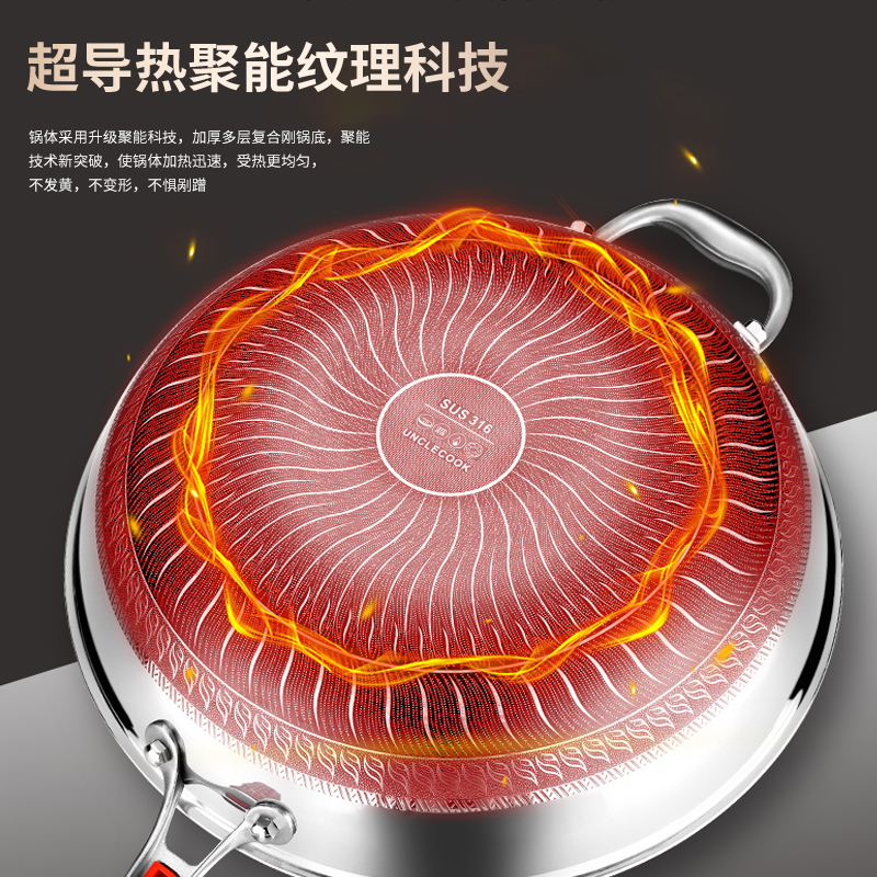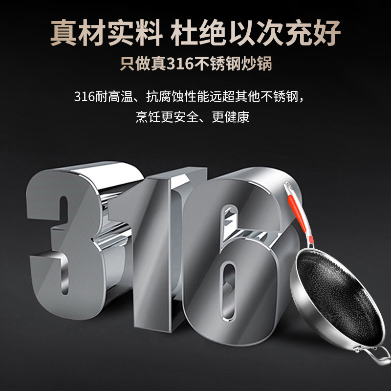 316不銹鋼,蜂窩設(shè)計物理不粘,無涂層可用鋼鏟,不糊底更耐刮,煤氣電磁爐通用