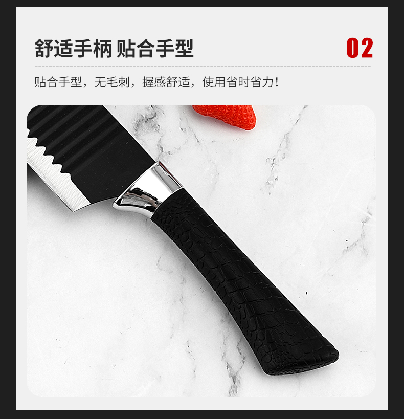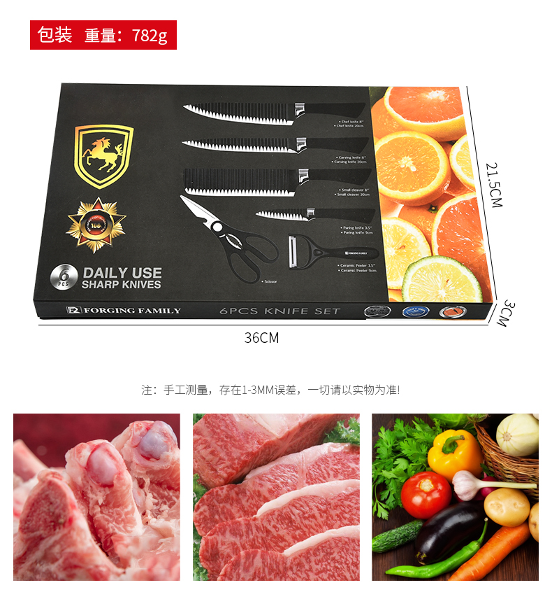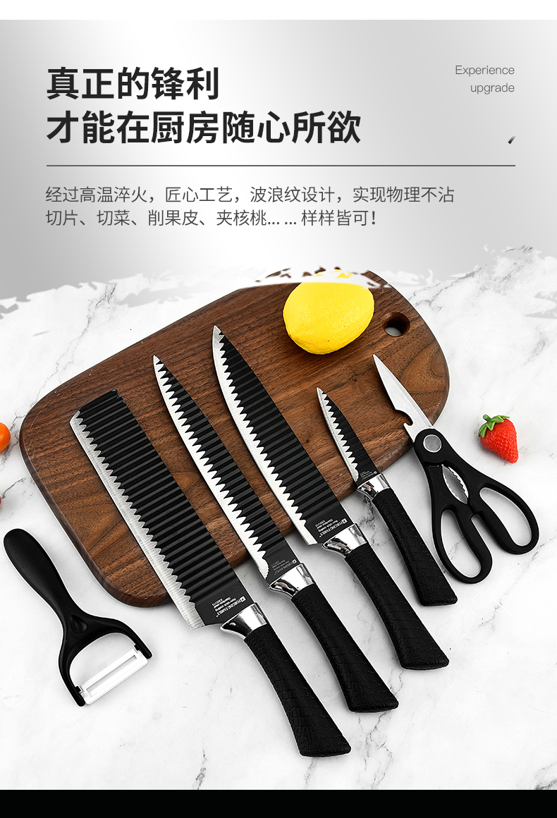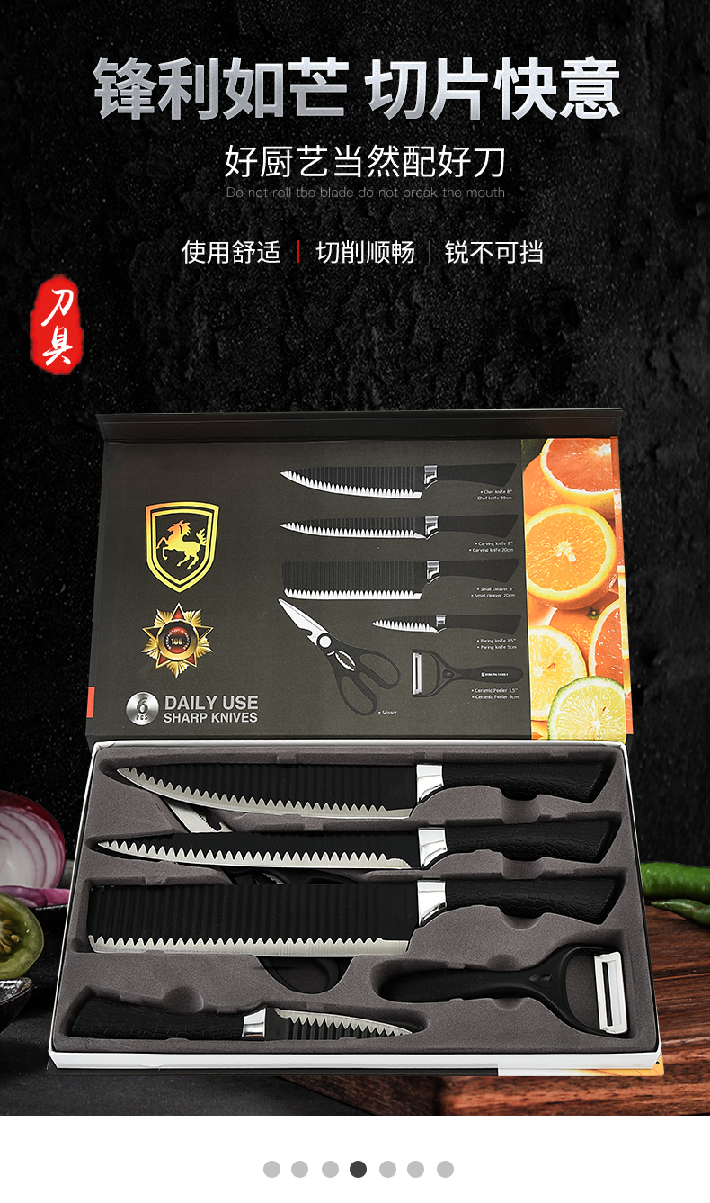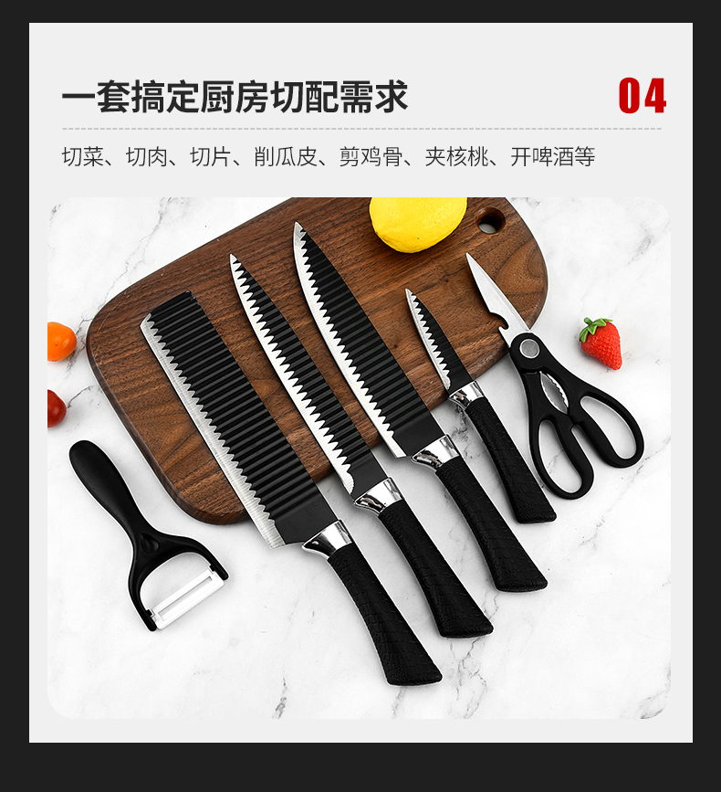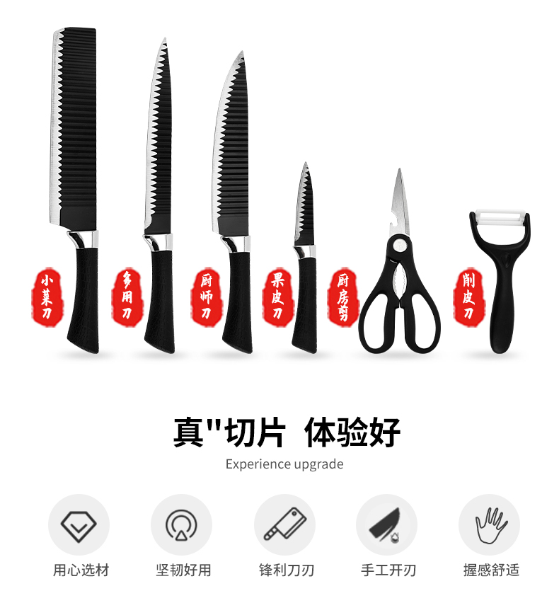 黑鋼硬度高,耐用鋒利,手柄握感輕松舒適,刀刃用心打磨保證鋒利度,六件套滿足廚房所需
