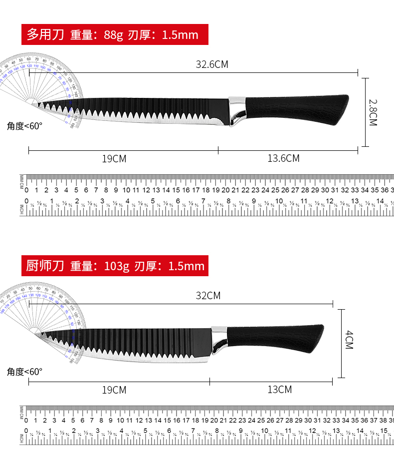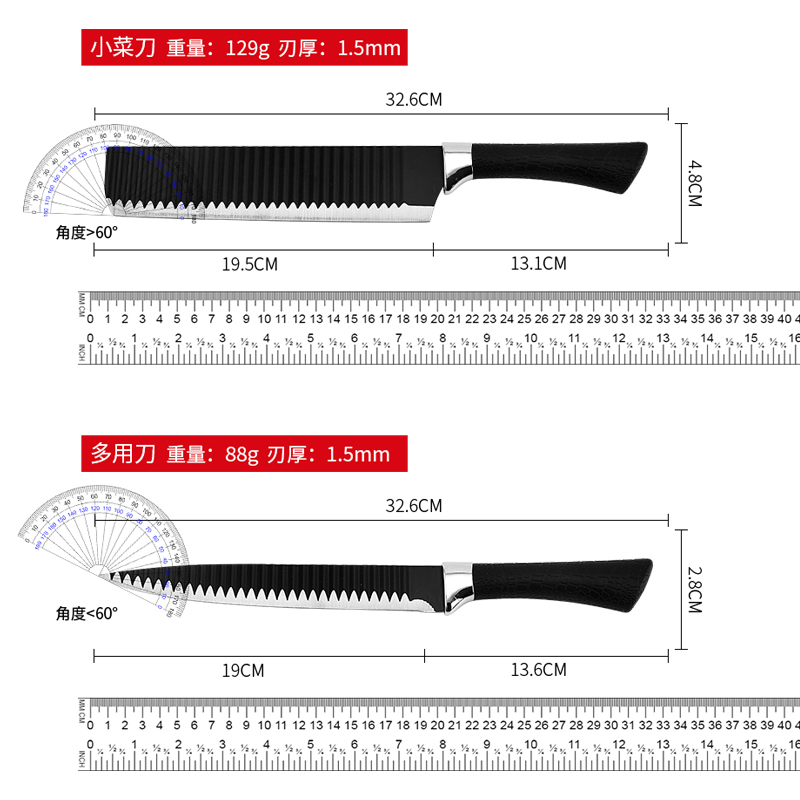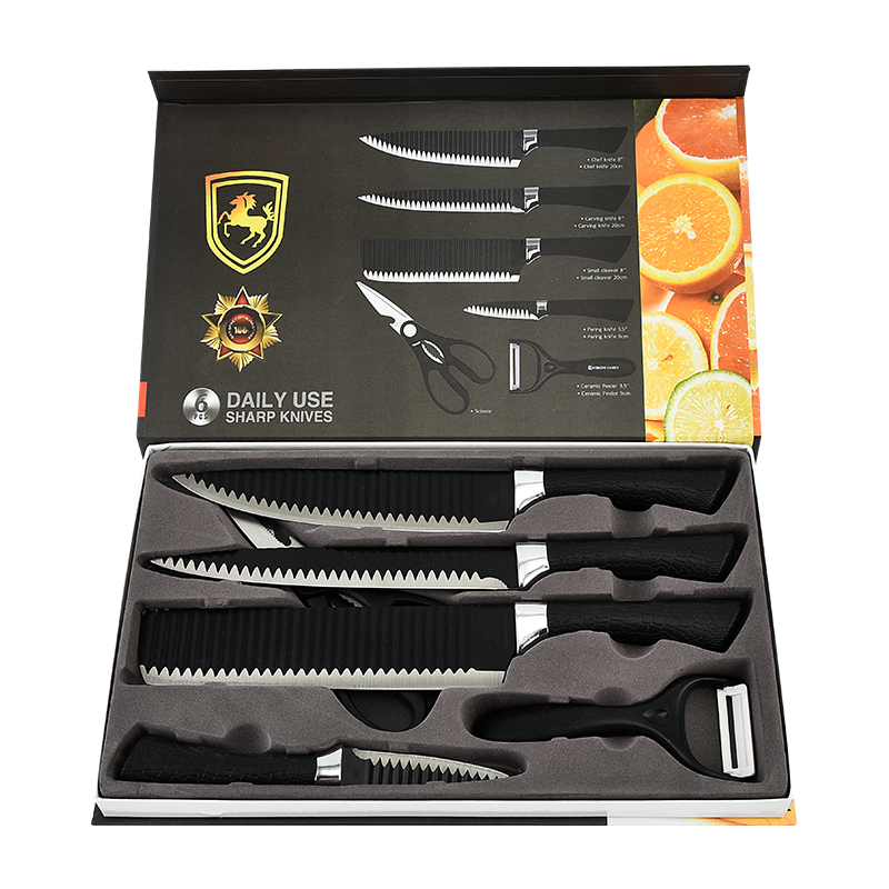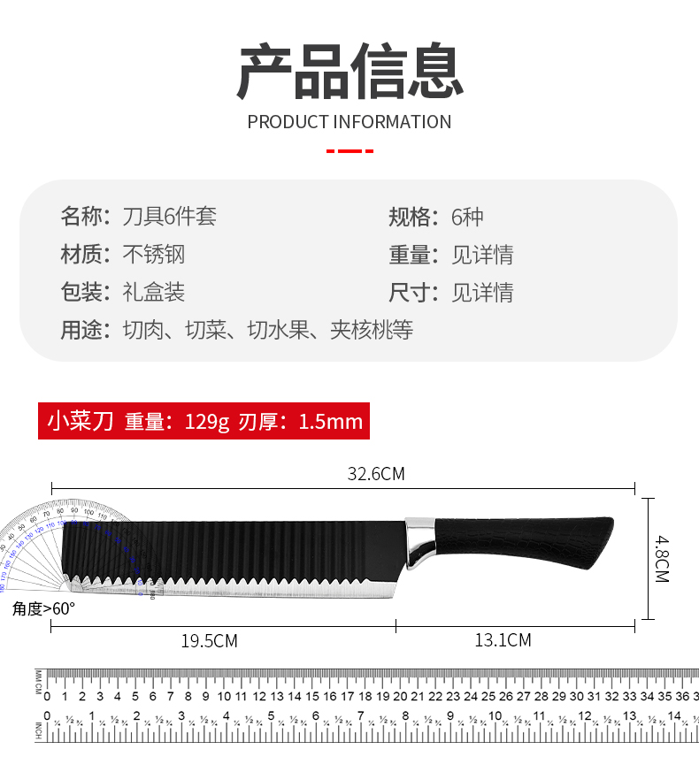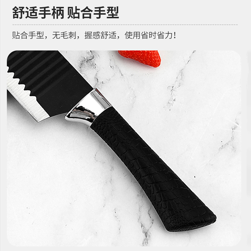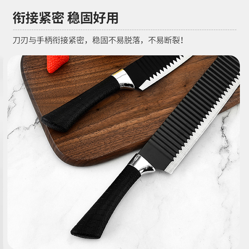 黑鋼硬度高,耐用鋒利,手柄握感輕松舒適,刀刃用心打磨保證鋒利度,六件套滿足廚房所需