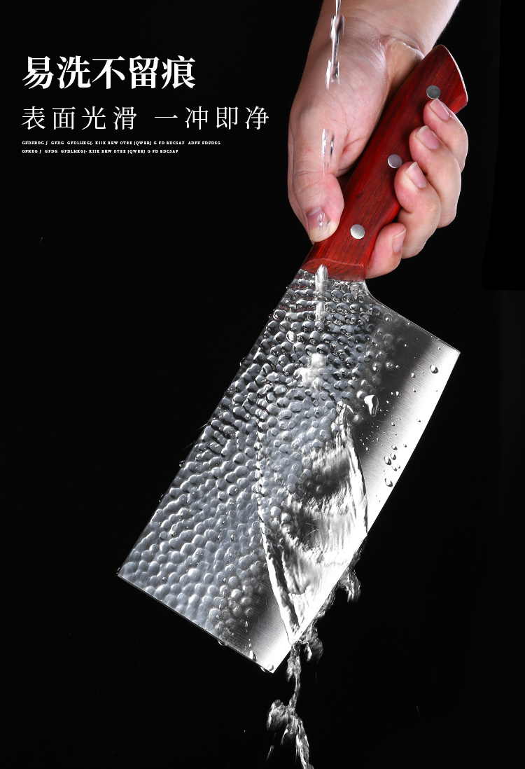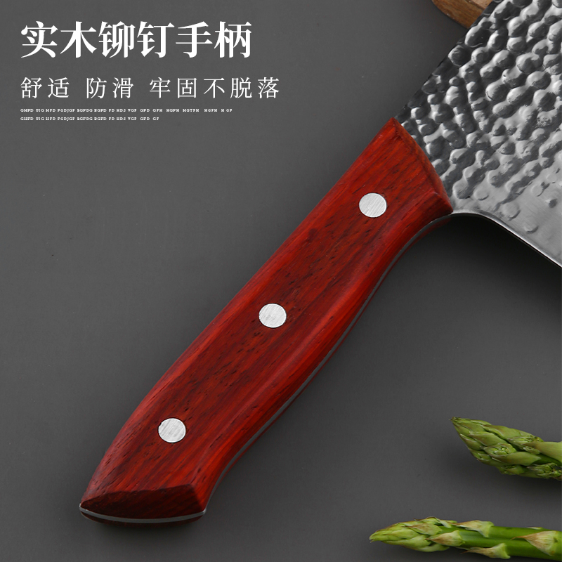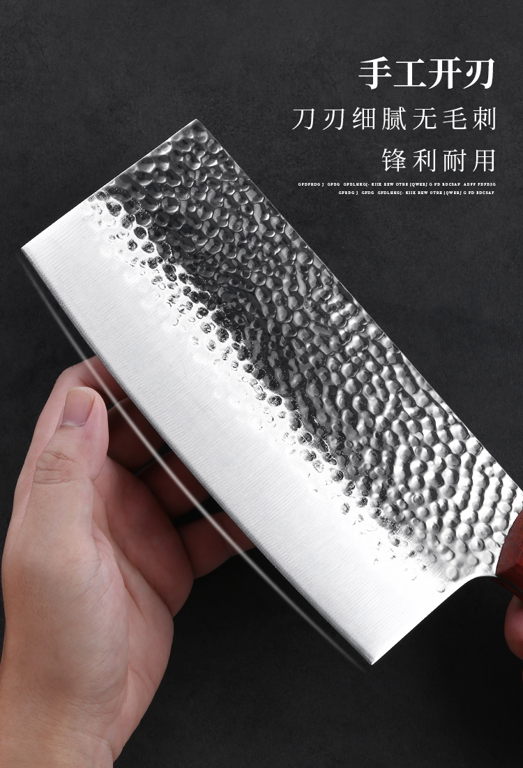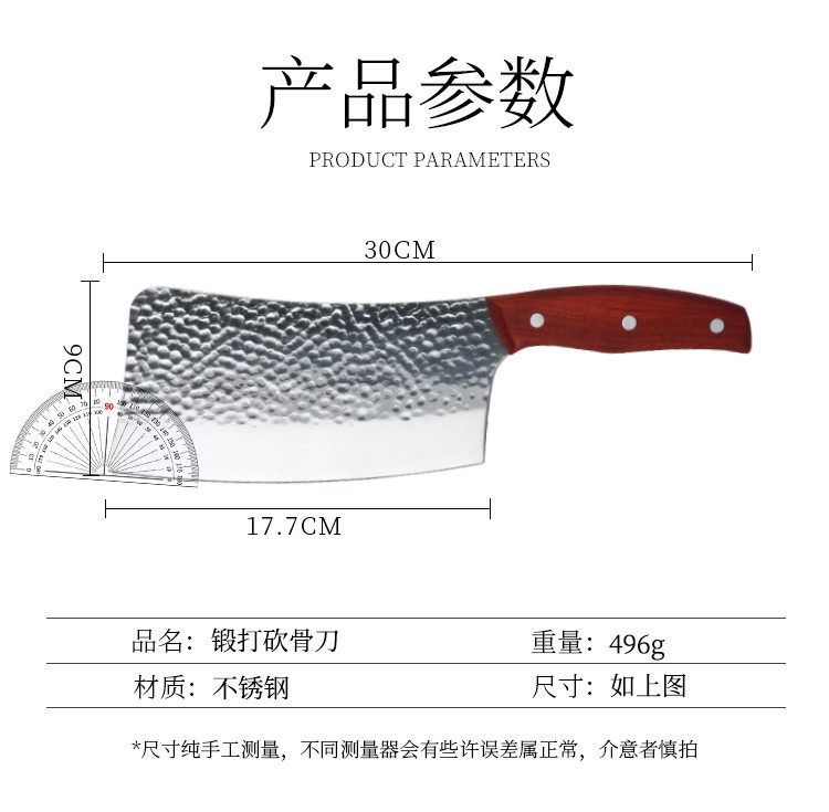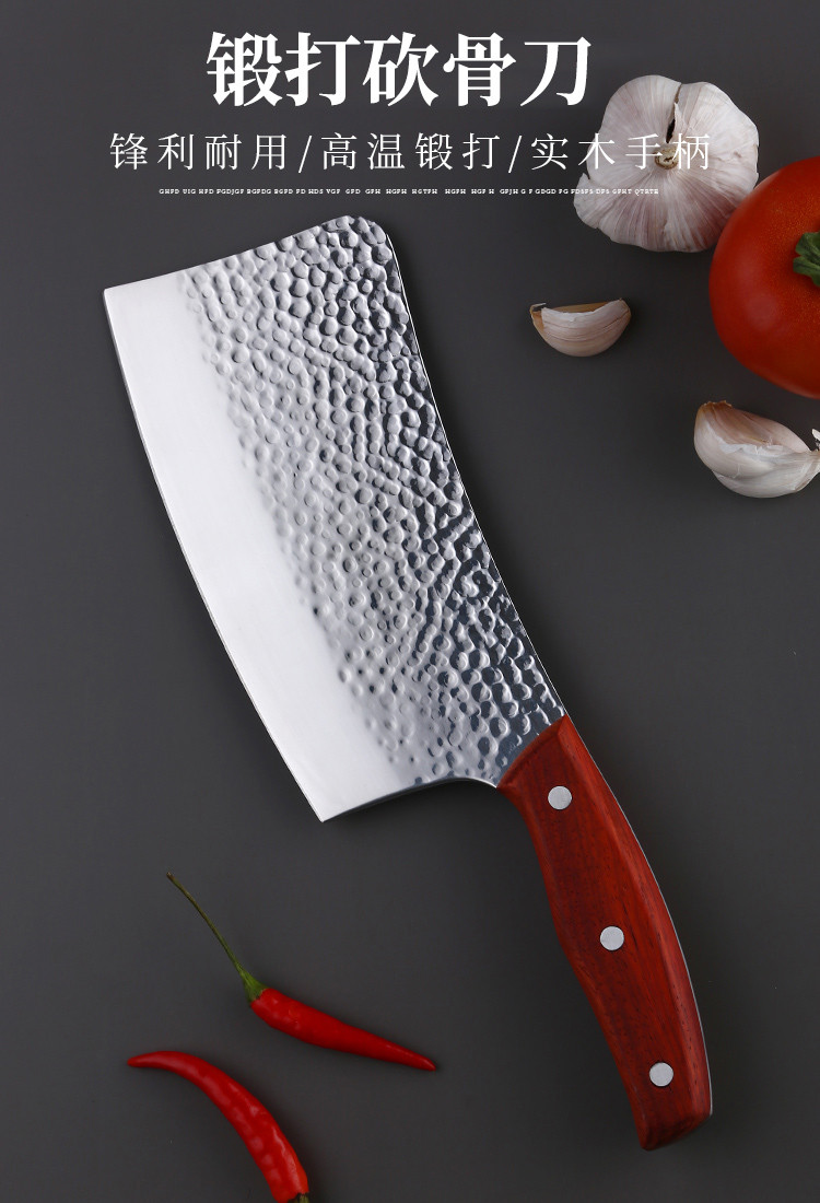 持久鋒利、耐用易磨,高硬度,鍛打漸薄刃口,鉚釘加固手柄更加牢固,用途:切片、切菜、切肉、砍骨頭等