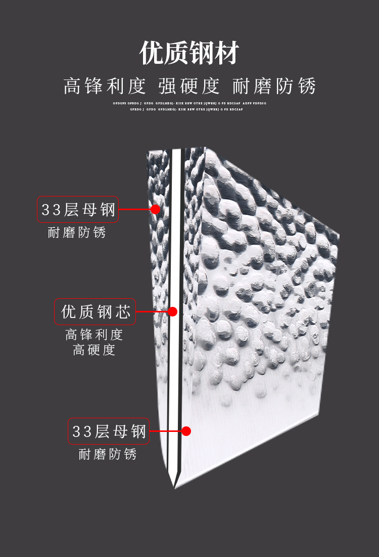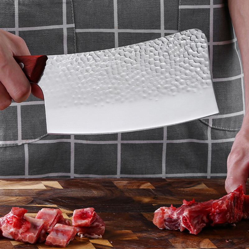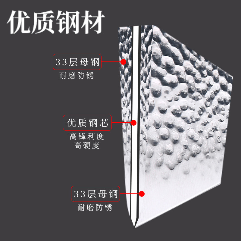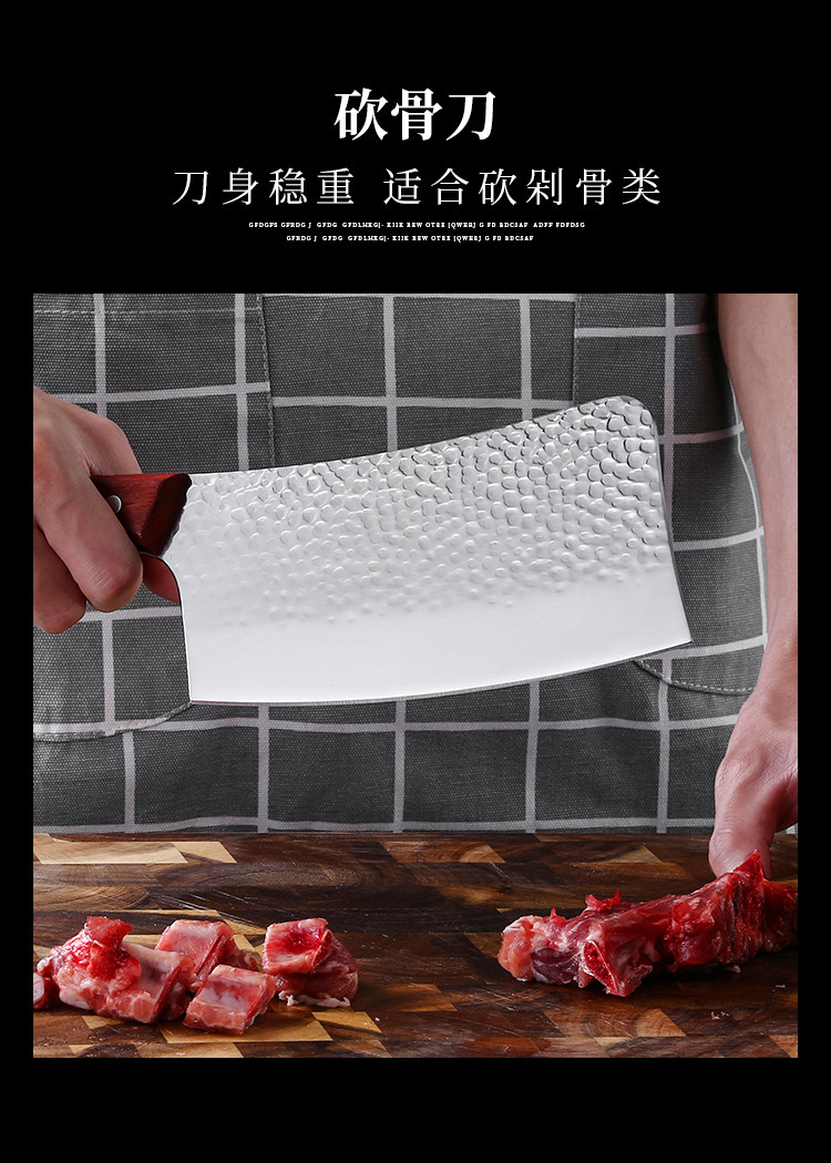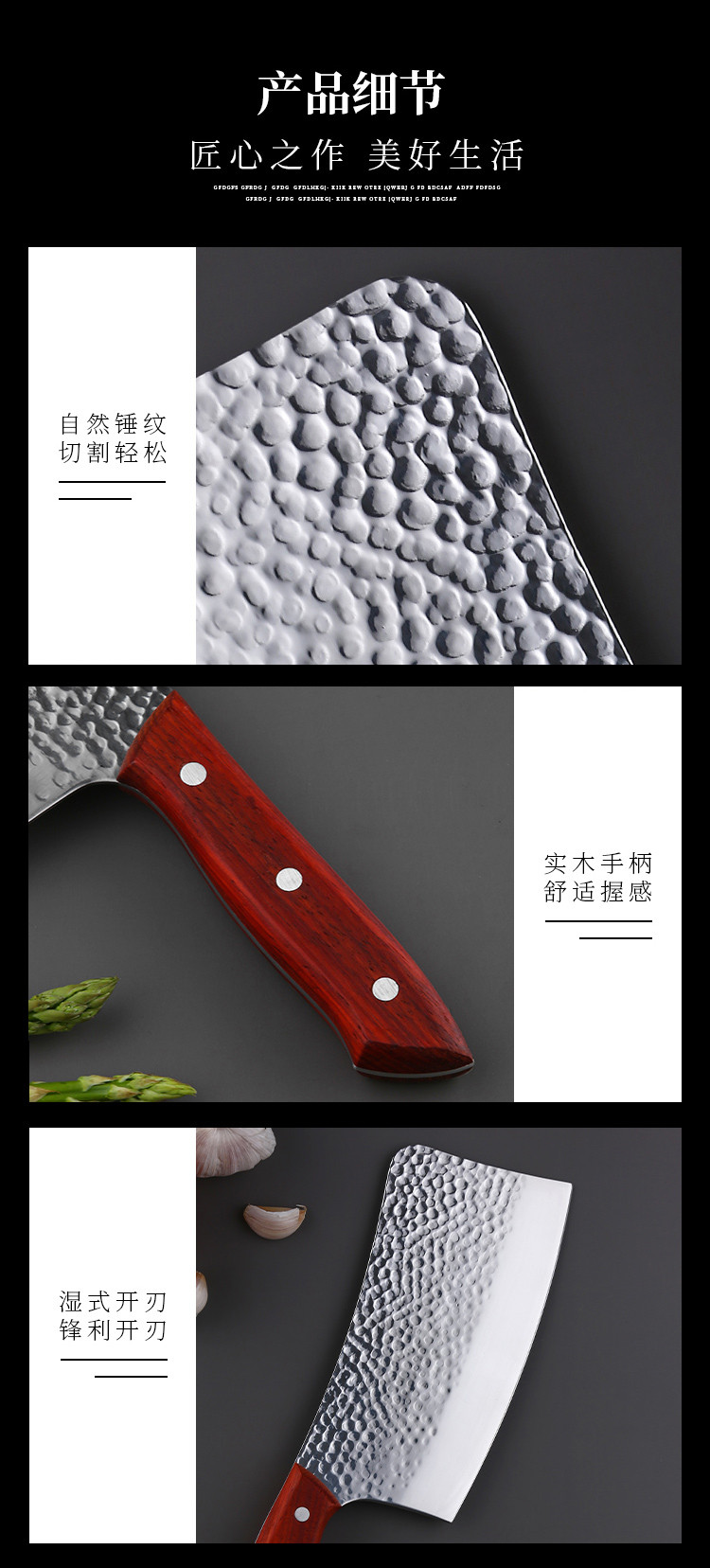 持久鋒利、耐用易磨,高硬度,鍛打漸薄刃口,鉚釘加固手柄更加牢固,用途:切片、切菜、切肉、砍骨頭等