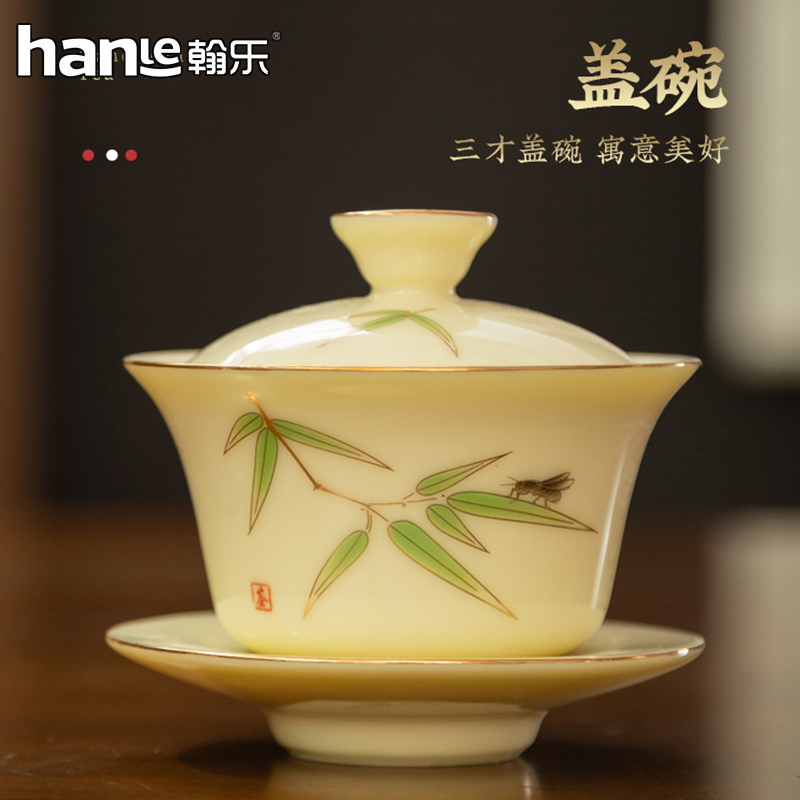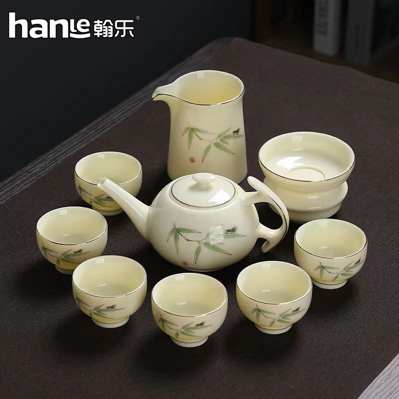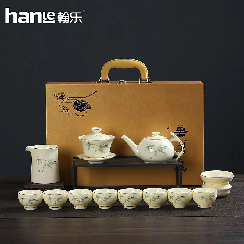 瓷色嫩黃明麗,格調清新高雅,胎質細膩堅結,釉面瑩潤晶亮胎釉結合致密,渾然一體。白中泛黃,黃中閃白,呈脂黃色半透明,質如純凈淡黃的玉石,故名寶石黃,十三件套的配置描金三才蓋碗瓷質細膩,奢華大氣,溫潤如玉,曲線柔和優美圓潤蓋鈕手握舒適;凹槽底托,穩固蓋碗。茶壺造型別致,圓潤飽滿,壺把設計巧妙,新穎出眾,手握舒適不燙手,細長壺嘴,出水如柱,斷水利落干凈。品杯輕盈靈巧,曲線玲瓏,杯身浮雕蓮花圖案栩栩如生,可賞可玩;圓潤杯口,唇感舒適,底足平整,不傷桌面。