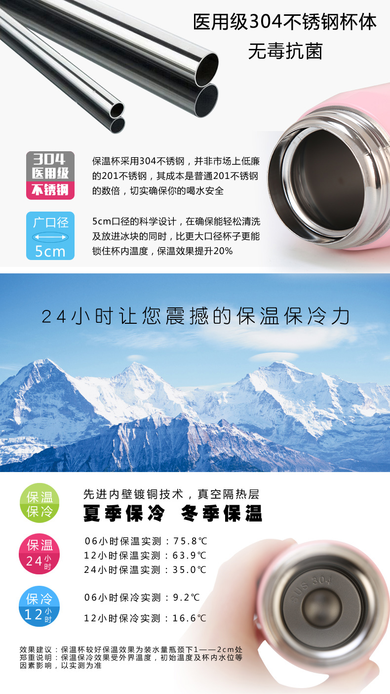 2、超長保溫:304不銹鋼內外膽,12小時以上高質量保溫保冷