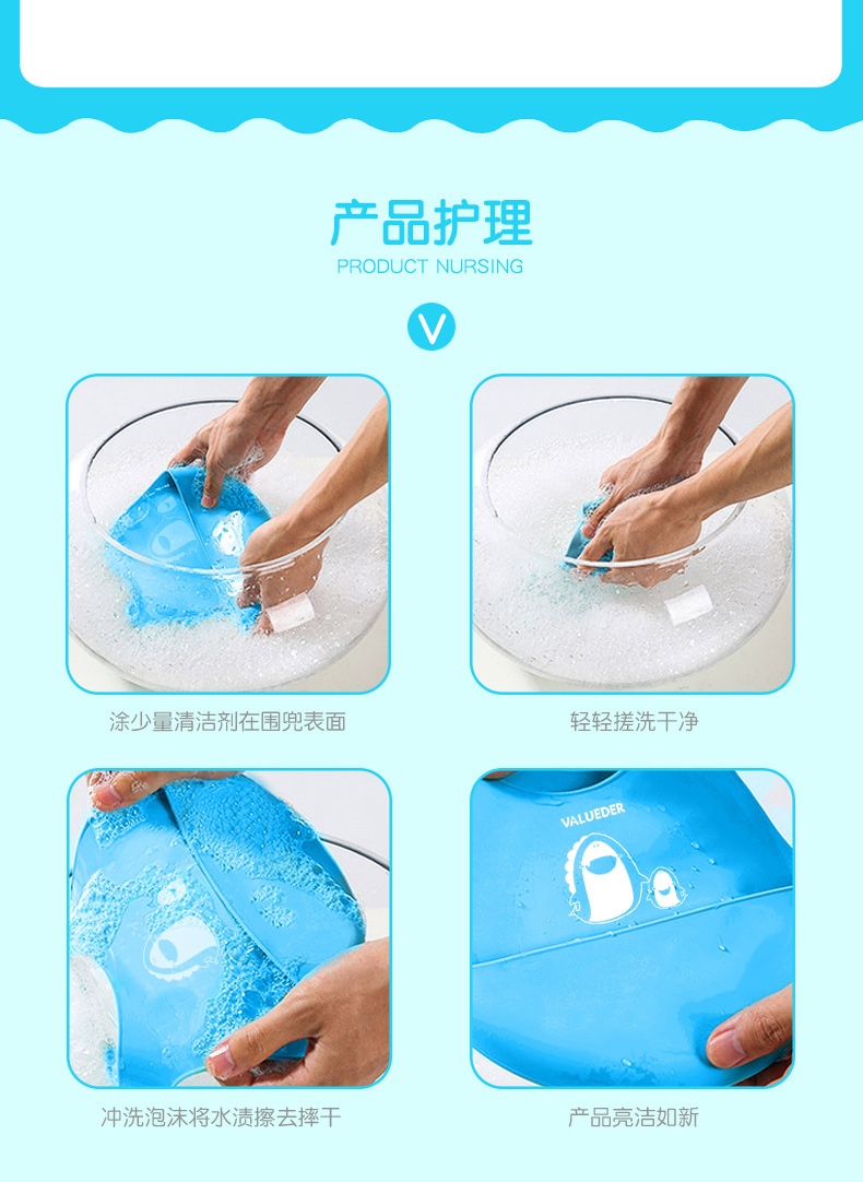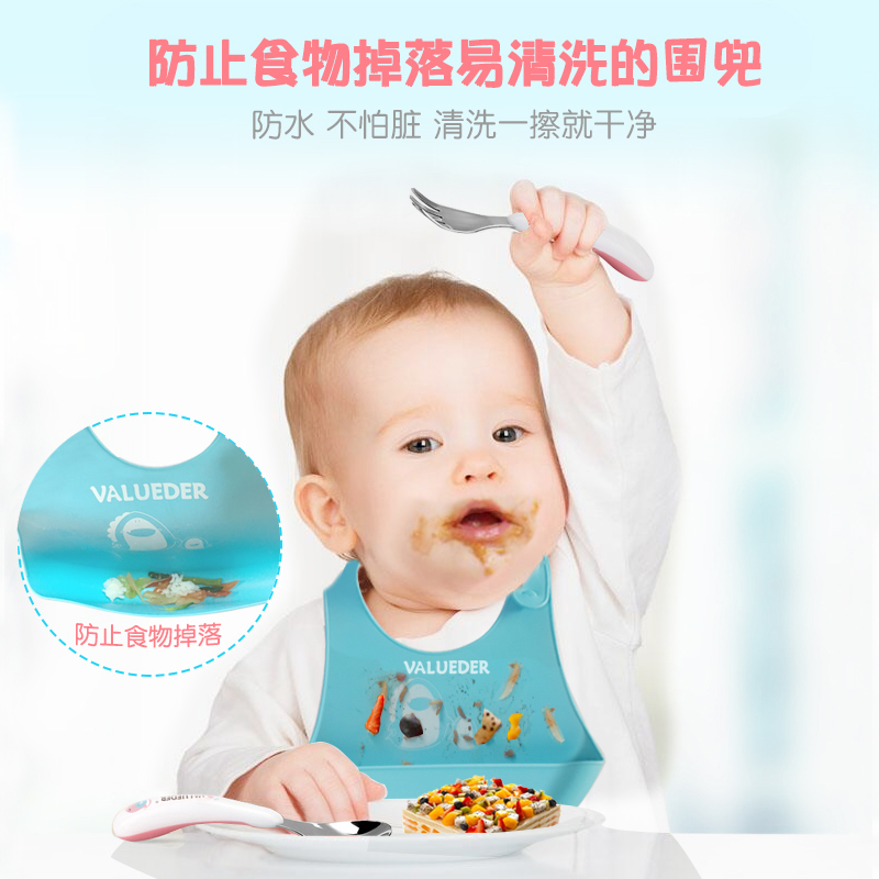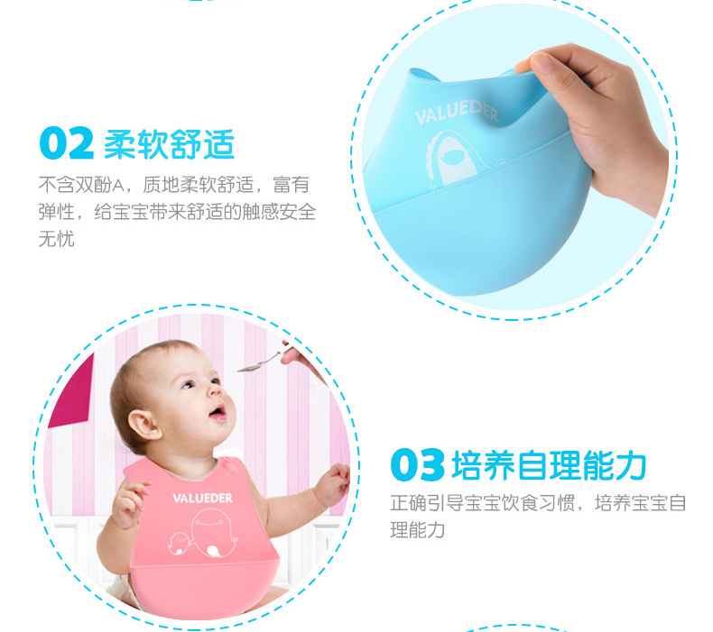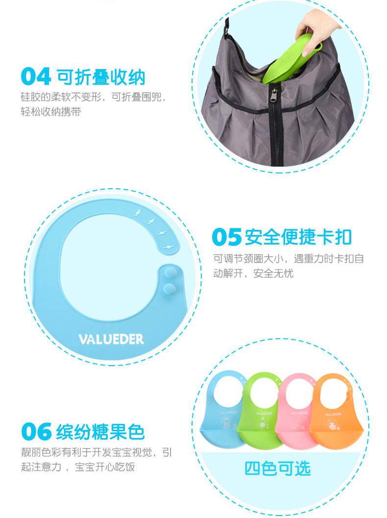 繽紛糖果色,安全便捷卡扣,3D人工學設計,可折疊攜帶方便,柔軟硅膠,食品級材質,正確引導寶寶飲食習慣,培養寶寶自理能力