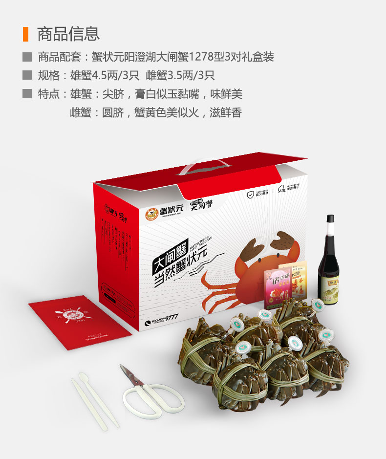 商品套餐:雄蟹4.5兩/3只 雌蟹3.5兩/3只