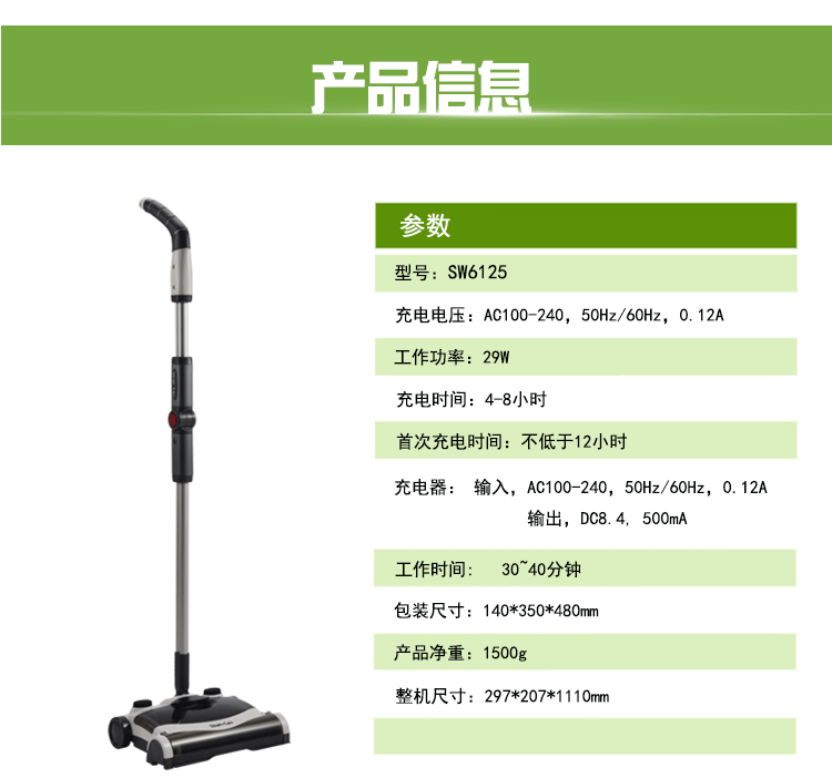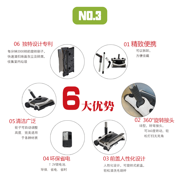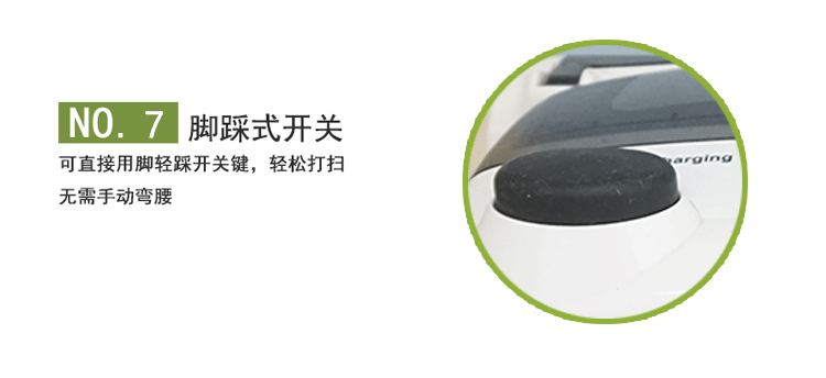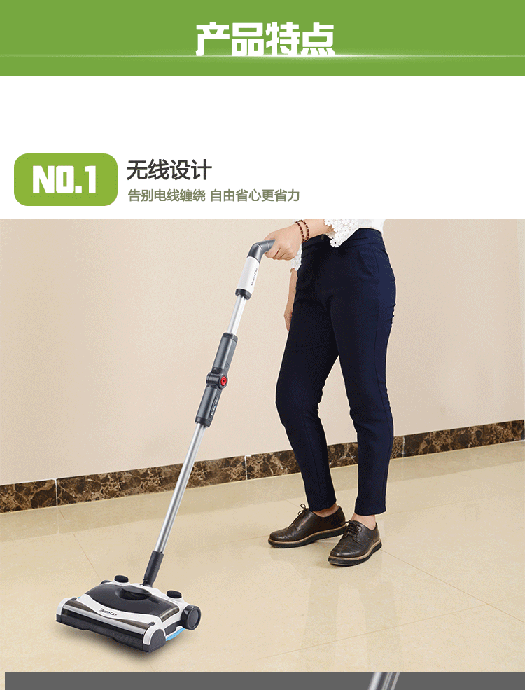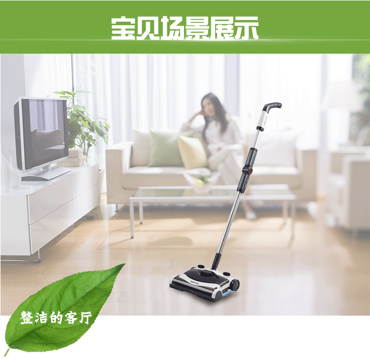 5.每分鐘2000轉(zhuǎn)的旋轉(zhuǎn)刷子,從前向后清掃地面灰塵及碎屑,收集室內(nèi)垃圾。