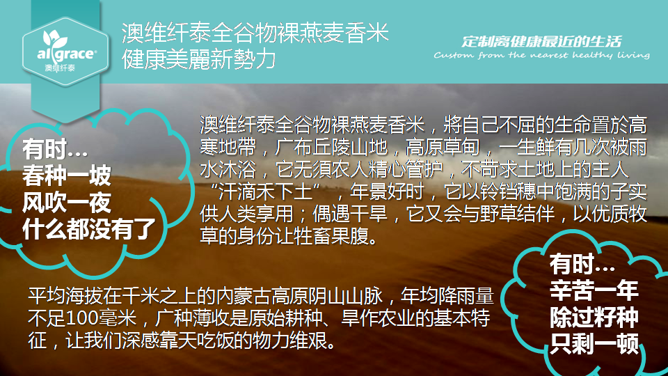 澳維纖泰裸燕麥香米生長在北緯41°,海拔1000米以上,沒有受到工業(yè)污染的中國西部內(nèi)蒙古高原地帶。生長過程堅持有機栽培的耕種方式。