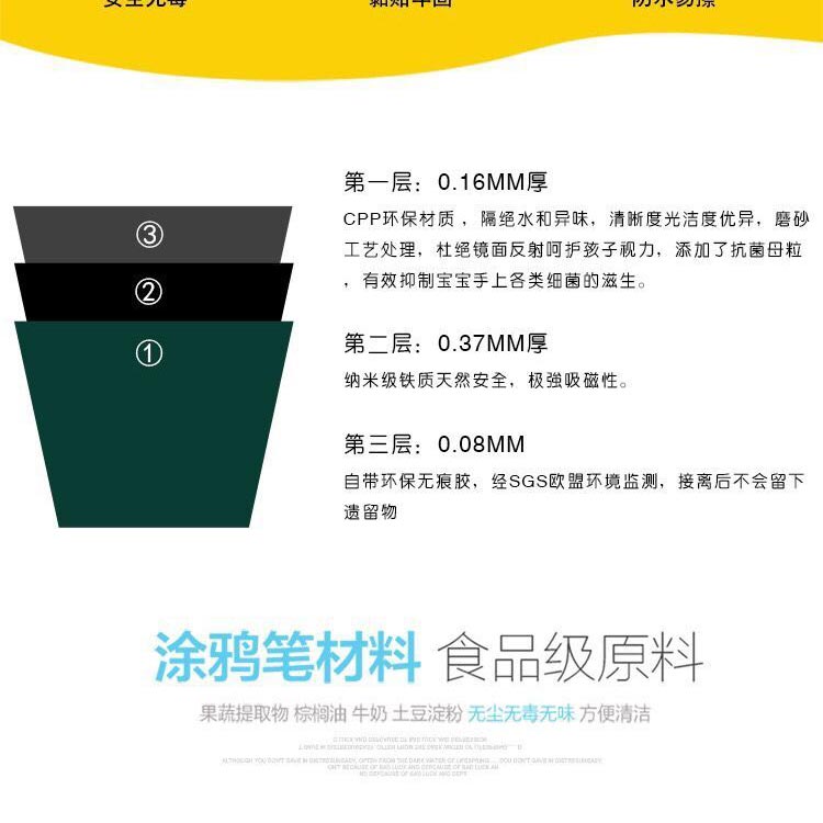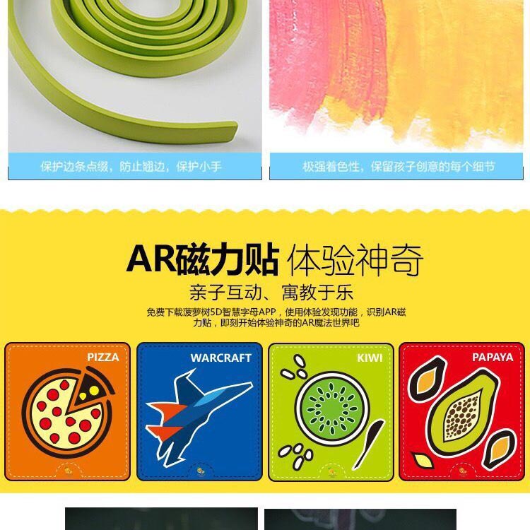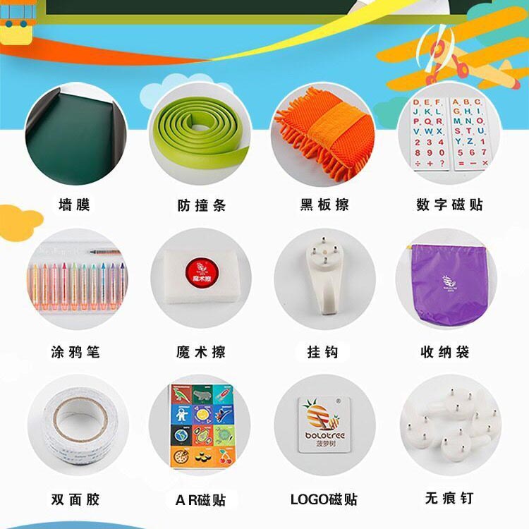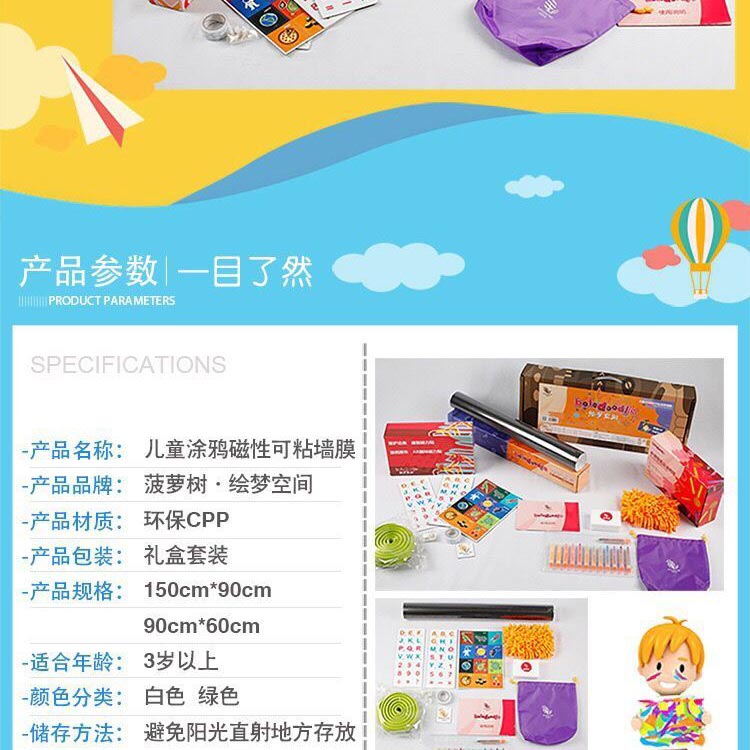 菠蘿樹涂鴉墻膜,進(jìn)口環(huán)保塑膠,表層磨砂處理,不反光,國(guó)際標(biāo)準(zhǔn)護(hù)眼綠色,多種尺寸供選擇??捎?0年,不脫落,不翹邊。含13色食品級(jí)可擦洗涂鴉筆禮盒裝,無揮發(fā),無異味,無粉塵,同時(shí)配防撞裝飾邊條;高級(jí)雪妮絨抹布等; 打造寶寶專屬的涂鴉學(xué)習(xí)空間!