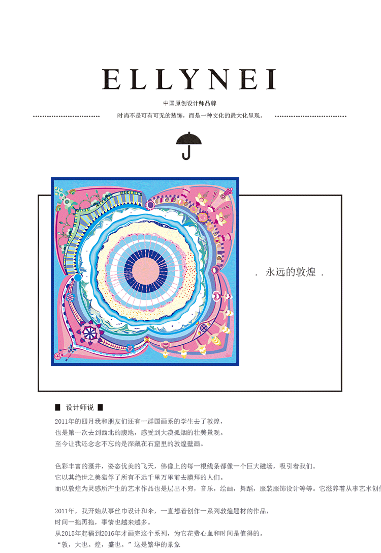 2011年,我開始從事絲巾設計和傘,一直想著創作一系列敦煌題材的作品,時間一拖再拖,事情也越來越多。從2015年起稿到2016年才畫完這個系列,為它花費心血和時間是值得的。