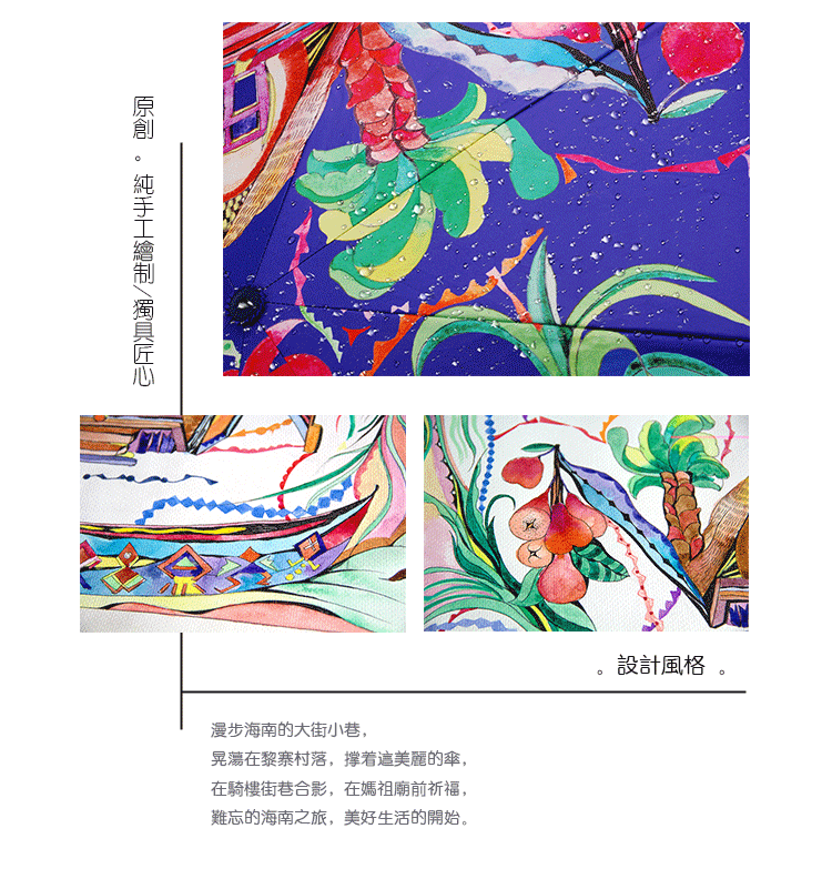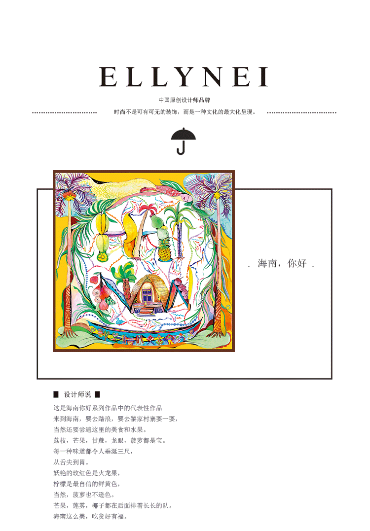 這是海南你好系列作品中的代表性作品 來到海南,要去踏浪,要去黎家村寨耍一耍, 當然還要嘗遍這里的美食和水果。