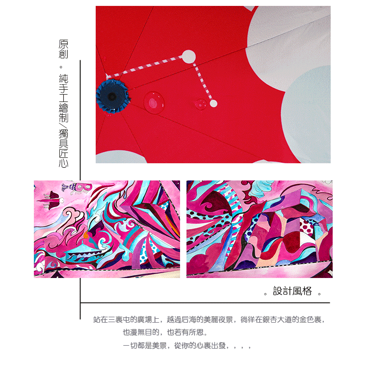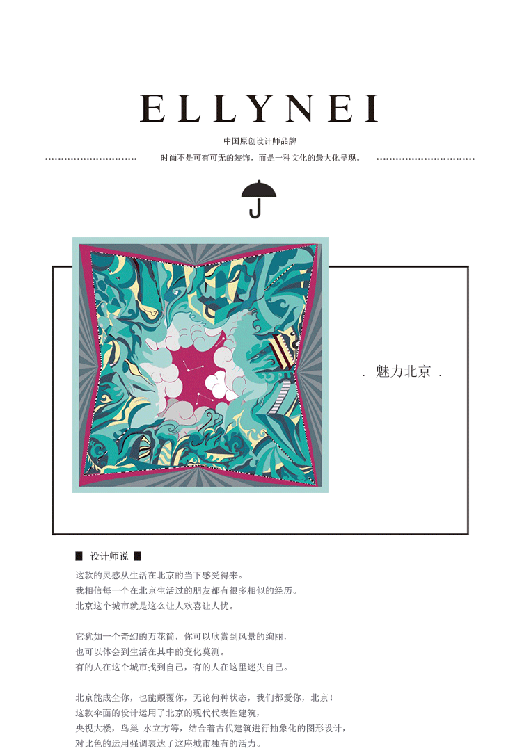這款雨傘的靈感從生活在北京的當(dāng)下感受得來,我相信每一個在北京生活過的朋友都有很多相似的經(jīng)歷。北京這個城市就是這么讓人歡喜讓人憂。它猶如一個奇幻的萬花筒,你可以欣賞到風(fēng)景的絢麗,也可以體會到生活在其中的變化莫測。有的人在這個城市找到自己,有的人在這里迷失自己。北京能成全你,也能顛覆你,無論何種狀態(tài),我們都愛你,北京!