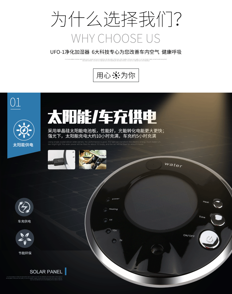 2、產品采用高品質單晶硅太陽能板,光電轉化效率高,陽光照射下可直接充電,續航能力強。