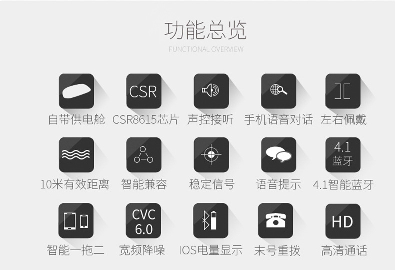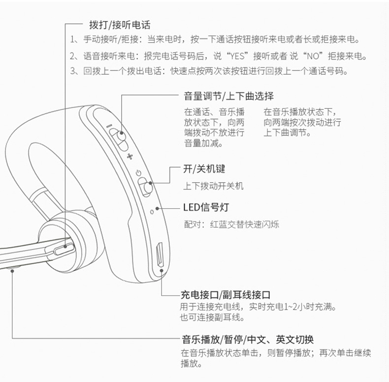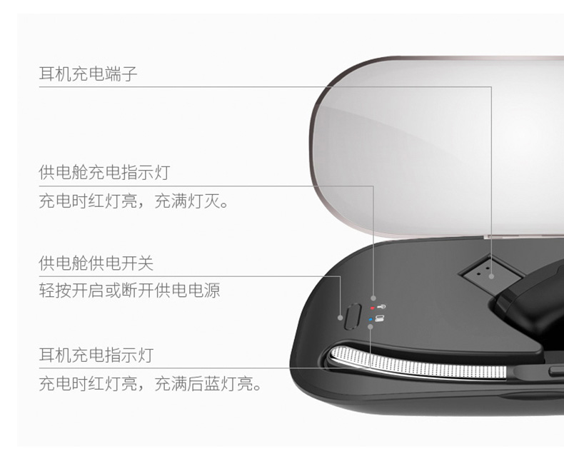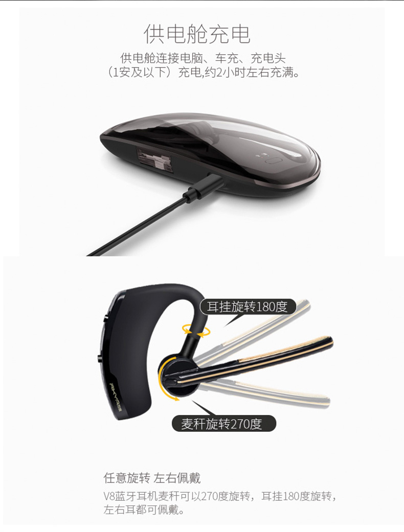 4、聲控接聽,來電播報,重播音量調(diào)節(jié),上下切換,180度左右耳佩戴,自帶供電倉