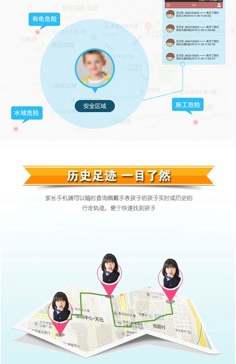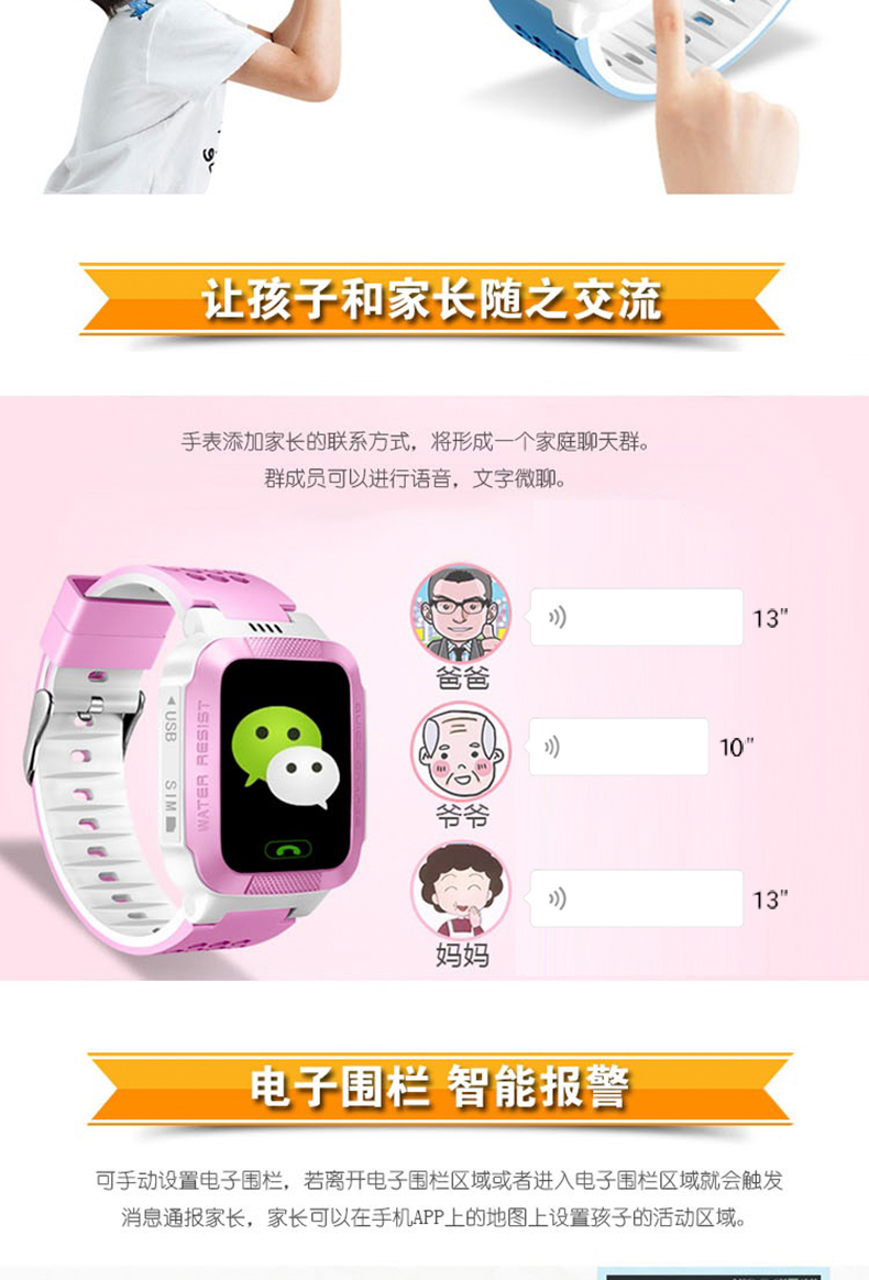 2、遠程智能定位、雙向通話、一鍵SOS求救、家庭群聊、拍照、電子圍欄、歷史足跡查詢。