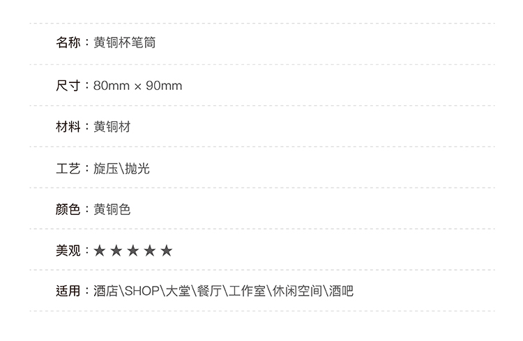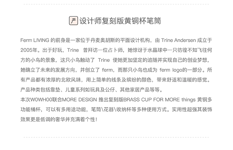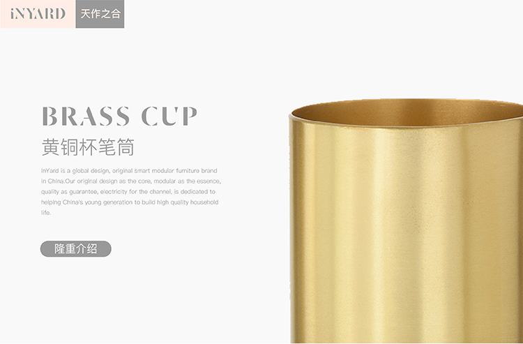 本次inyard嚴選聯合MORE DESIGN 推出復刻版BRASS CUP FOR MORE things 黃銅多功能桶杯,可以有多用途功能,筆筒\花器\收納杯等多種使用方式。實用性超強其裝飾效果更是低調的奢華并充滿著個性!(黃銅材質的產品避免碰水哦,黃銅遇水是易氧化起銹斑的。) 舉報 極有家認證[原創設計]:專屬設計,限量生產,只為你造 商家承諾:提供“材質保真”服務,如材質與描述不符可獲賠200%