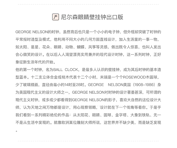 尼爾森眼睛掛鐘極簡北歐風壁掛鐘創意現代壁鐘,出口品質,細節工藝精湛。 舉報 極有家認證[原創設計]:專屬設計,限量生產,只為你造 商家承諾:提供“材質保真”服務,如材質與描述不符可獲賠200%