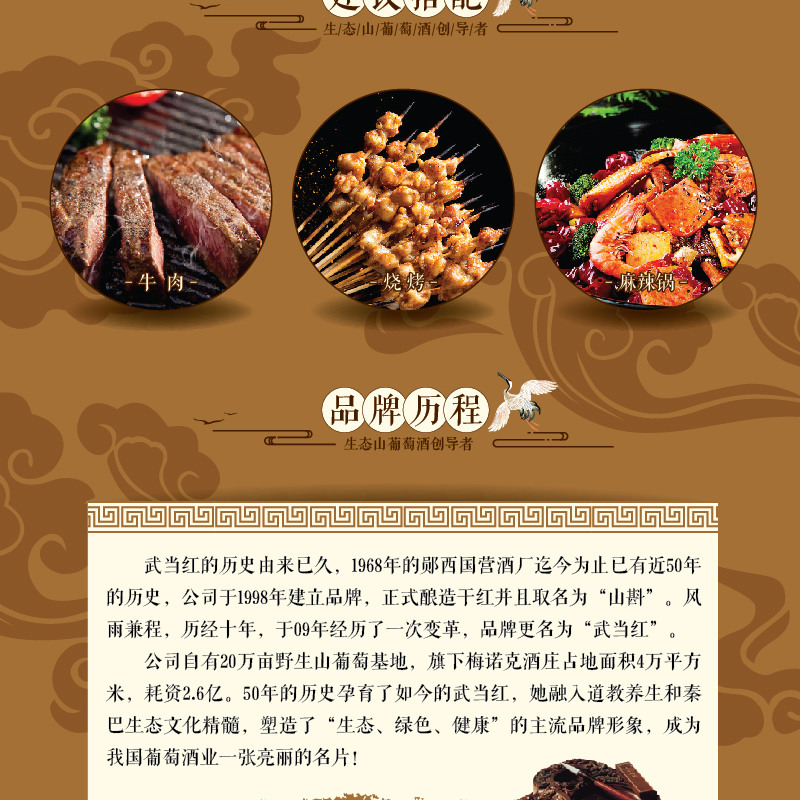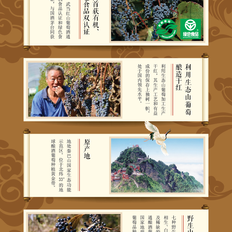 武當紅生態山葡萄酒,產自著名的梅諾克酒莊,其擁有20萬畝的野生葡萄基地。其單寧含量是普通葡萄酒的10倍,白藜蘆醇含量是普通葡萄酒的2-3倍。白藜蘆醇被稱為植物抗毒素,對腫瘤、動脈硬化、心腦血管疾病都有著不可替代的預防及治療作用。武當紅有機野生山葡萄酒將高品質的生活態度與品酒結合,讓生活更富有內涵。