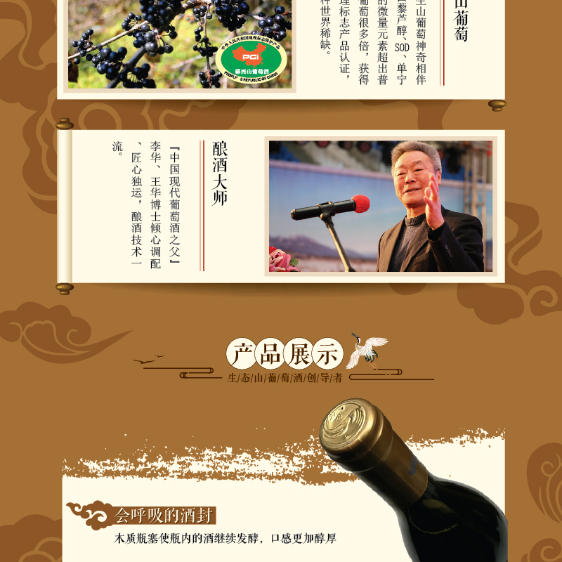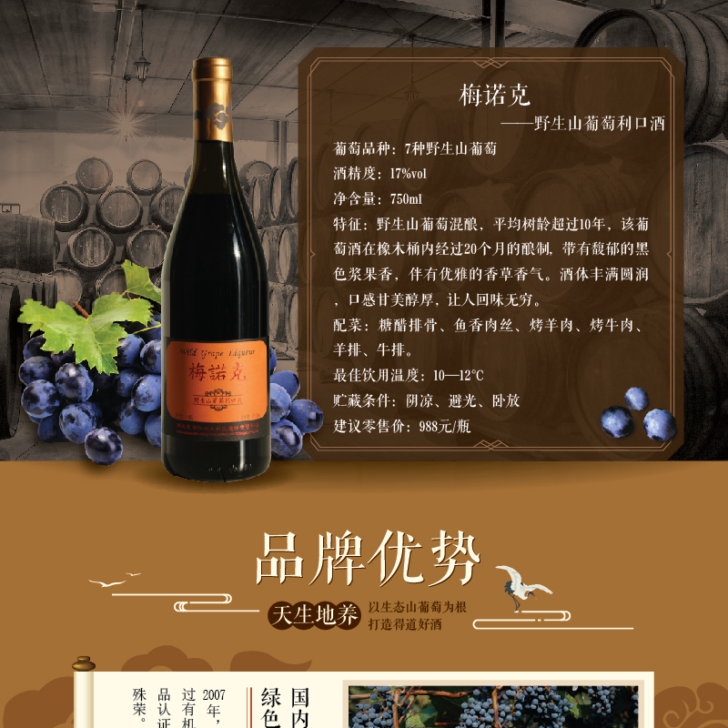 武當紅野生山葡萄利口酒,產自著名的梅諾克酒莊,其擁有20萬畝的野生葡萄基地。武當紅有機野生山葡萄酒的單寧含量是普通葡萄酒的10倍,白藜蘆醇含量是普通葡萄酒的2-3倍。白藜蘆醇被稱為植物抗毒素,對腫瘤、動脈硬化、心腦血管疾病都有著不可替代的預防及治療作用。武當紅有機野生山葡萄酒將高品質的生活態度與品酒結合,讓生活更富有內涵。